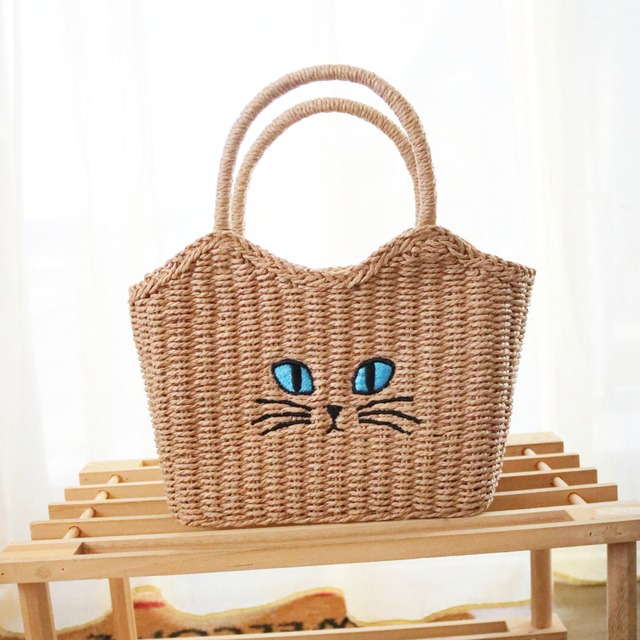 つぶらな瞳のネコがキュートな、かごバッグです。編み地が夏らしい軽やかな雰囲気を演出します。巾着タイプになっているので携帯や財布、水筒など、お出かけに必要なものがしっかりと収まります。 ・サイズ H18×W20×D12、持ち手立ち上り:14㎝ ・素材 分類外繊維(ペーパー)