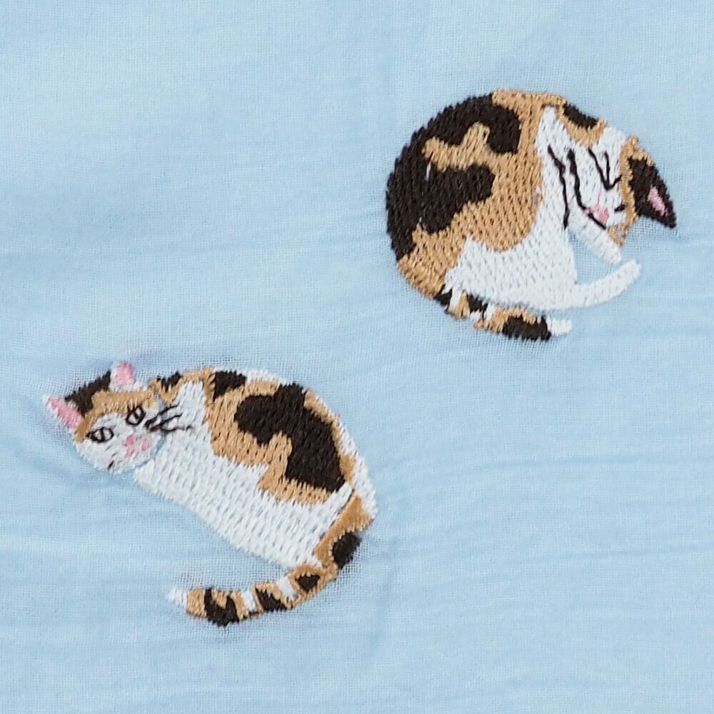 猫柄刺繍入りのスカーフ。UV対策に!Tシャツやカットソーなどの首元に。シュシュ付きなのでふわっと巻いて、シュシュで留めておけます。