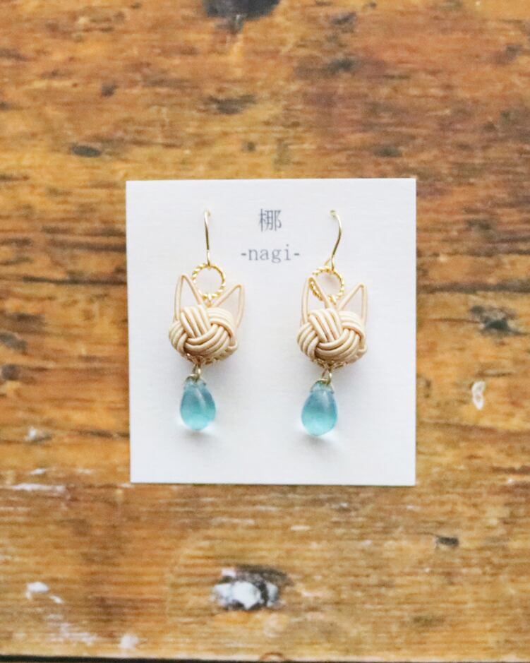 水引の「あわじ玉」をアレンジして制作した猫と、ドロップ型のチェコビーズが揺れるピアス。シンプルに見えて個性的なデザインの、猫好きの方におすすめのアクセサリーです!