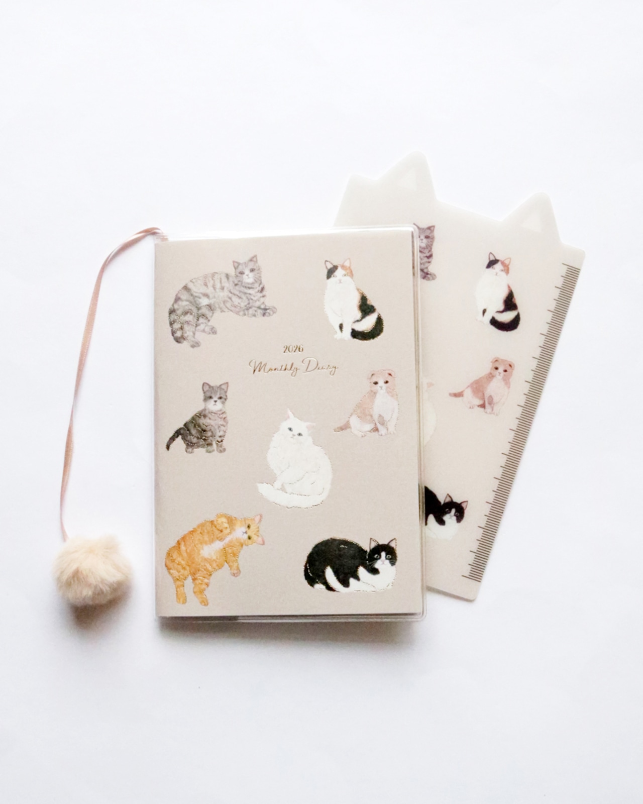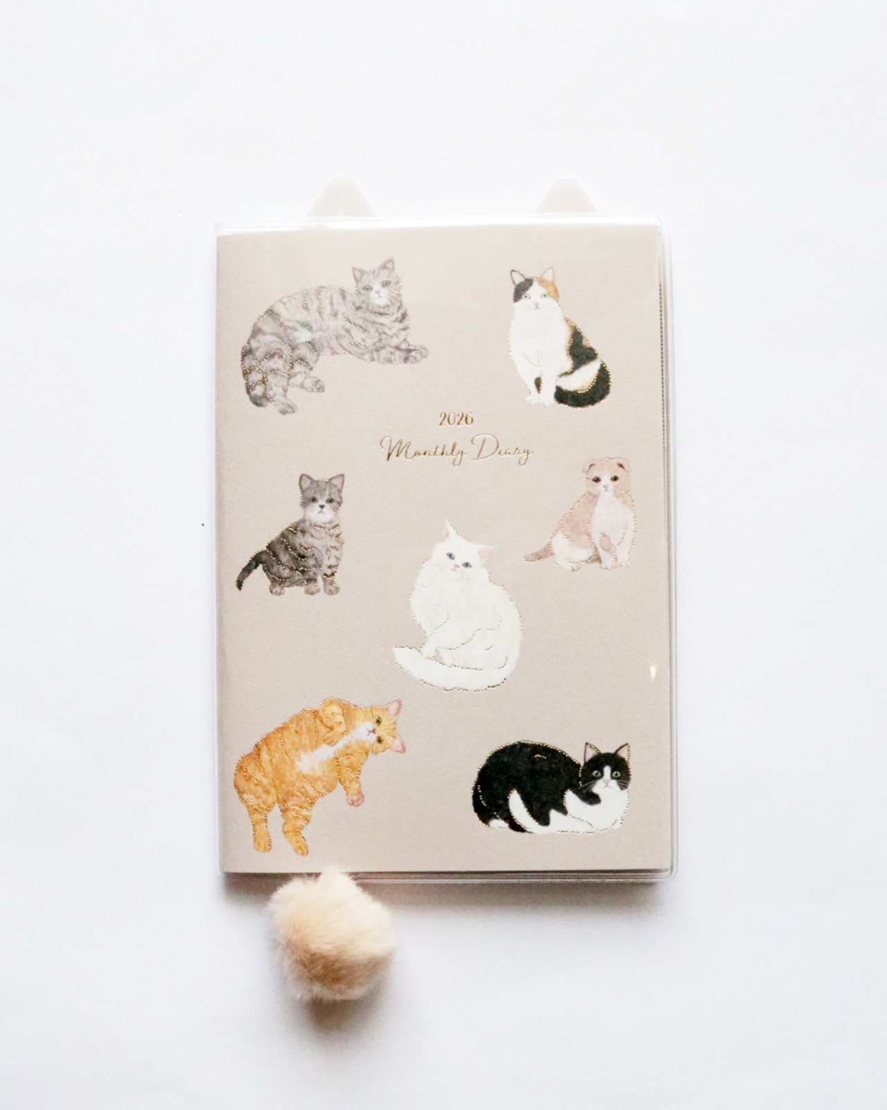 耳型の下敷きがセットの手帳。下敷きをセットで使うと猫型に♪ポンポン付きのダイアリーです。本文にも猫のイラスト入り。