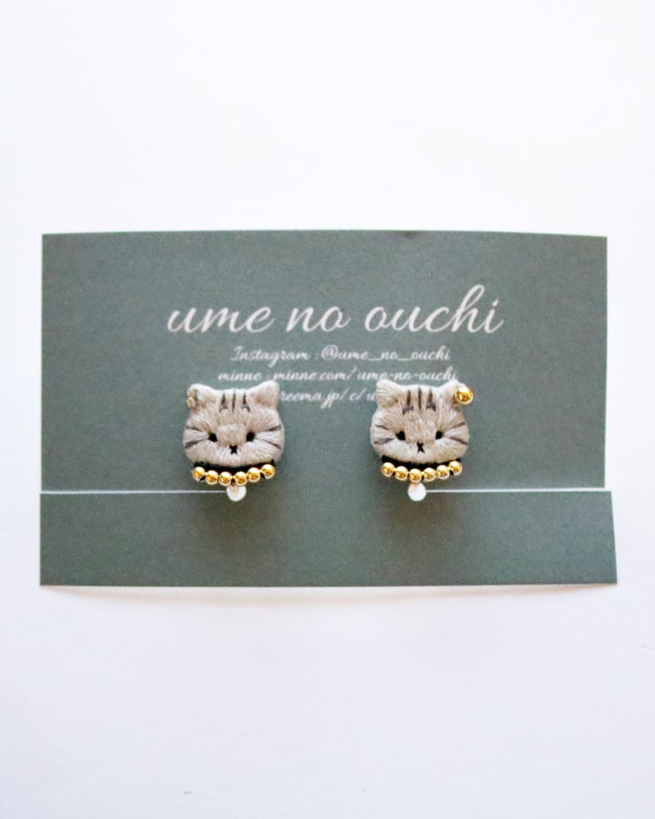 ピアス/刺繍耳飾り/サバトラ/うめのおうち
