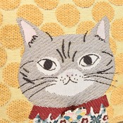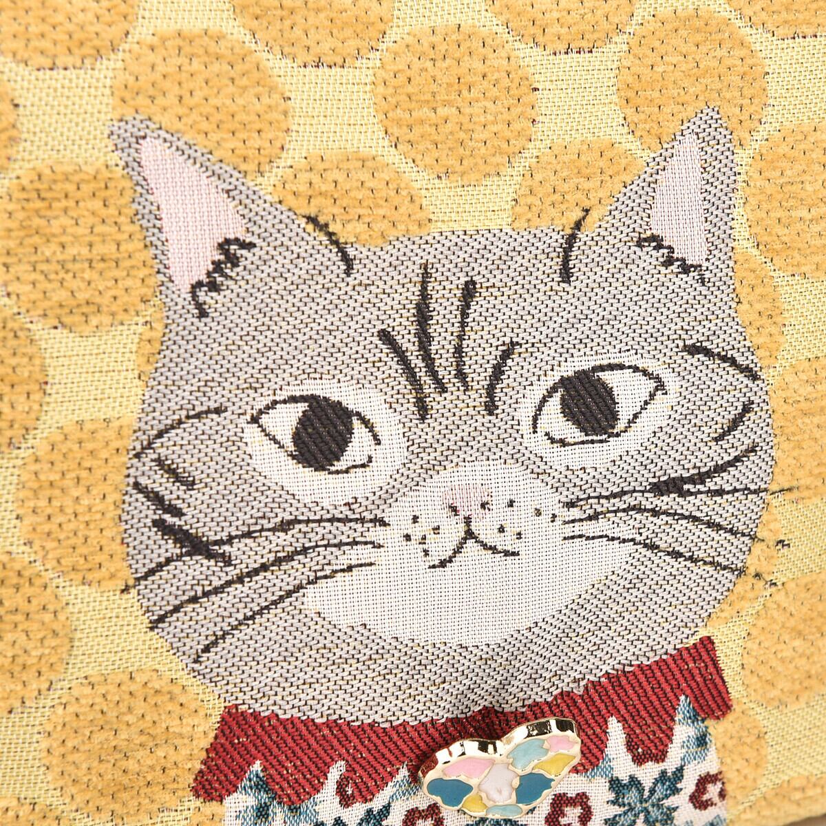 毛足のあるモール糸で織りあげたモコモコとした柔らかな肌触りの生地。ベルベットのような表面にほのかな光沢があり色に深みと奥行きがあります。そんなベース生地におめかし猫さん達が繊細にジャガードで織り込まれたポーチです。