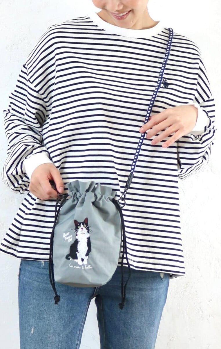 可愛い猫の刺繍がポイントのコードショルダー。高さがあるのでハンディファンが入れられます。ショルダーは外せるので巾着としてもお使いいただけます◎