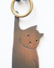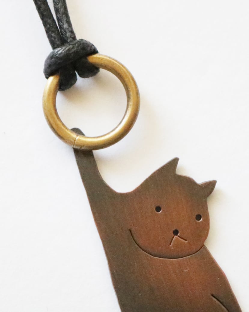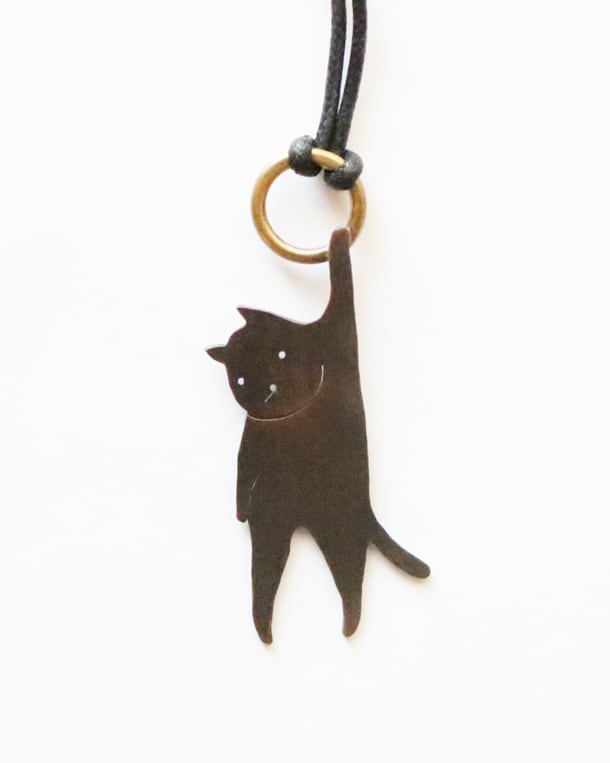 銅板の猫のペンダント。片手でぶら~んとぶら下がっている猫、表情がたまりません。