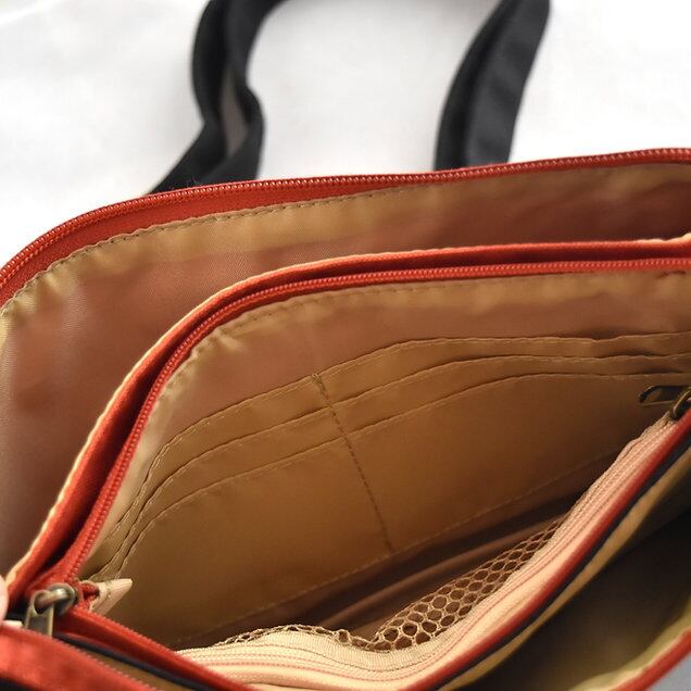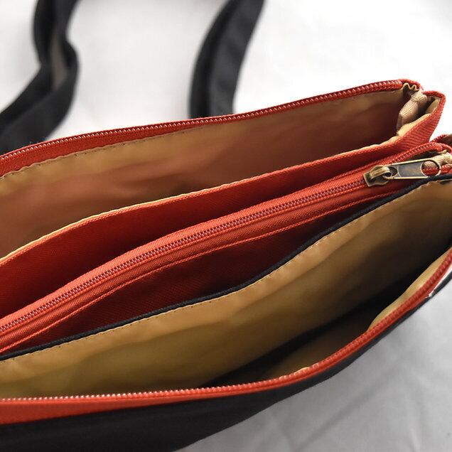 そのうち1室はファスナー付きのお財布仕様。メッシュのファスナー式小銭入れ、 カードポケット6室が備わっていて驚くほど実用的。旅行先などではメインバッグのほかに、すぐに取り出したいお金やカード、携帯電話、キー、リップ、ハンカチなどを持ち運ぶのに大変重宝します。