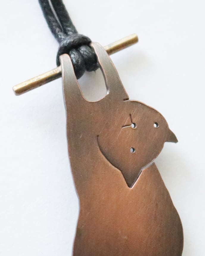 銅板の猫のペンダント。両手でぶら~んとぶら下がっている猫、表情がたまりません。