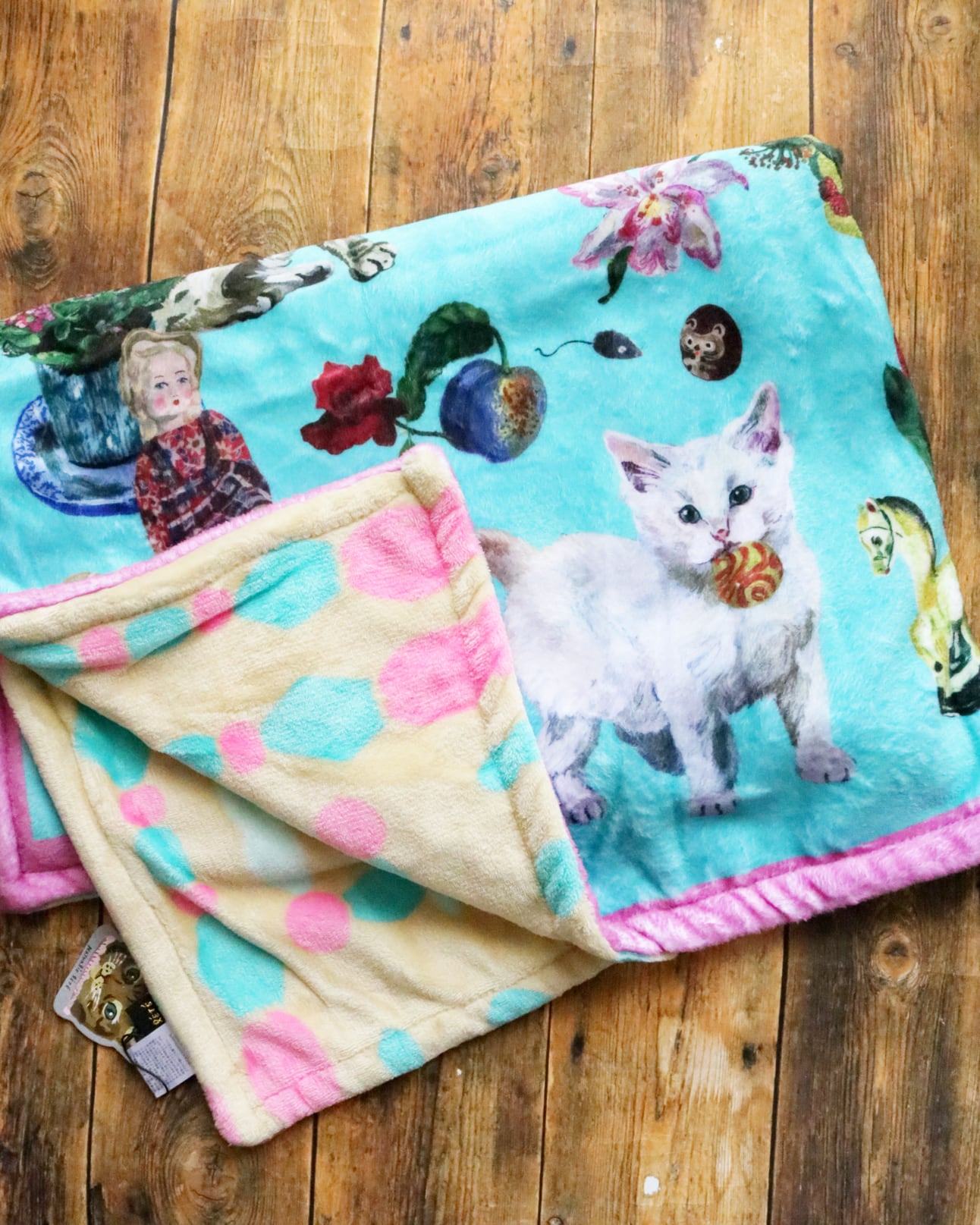 裏面は彼女の描くデザインをシルクプリントで仕上げることで、ポップながら優しい雰囲気です。ふわふわとしてなめらかな肌触りのブランケットです。