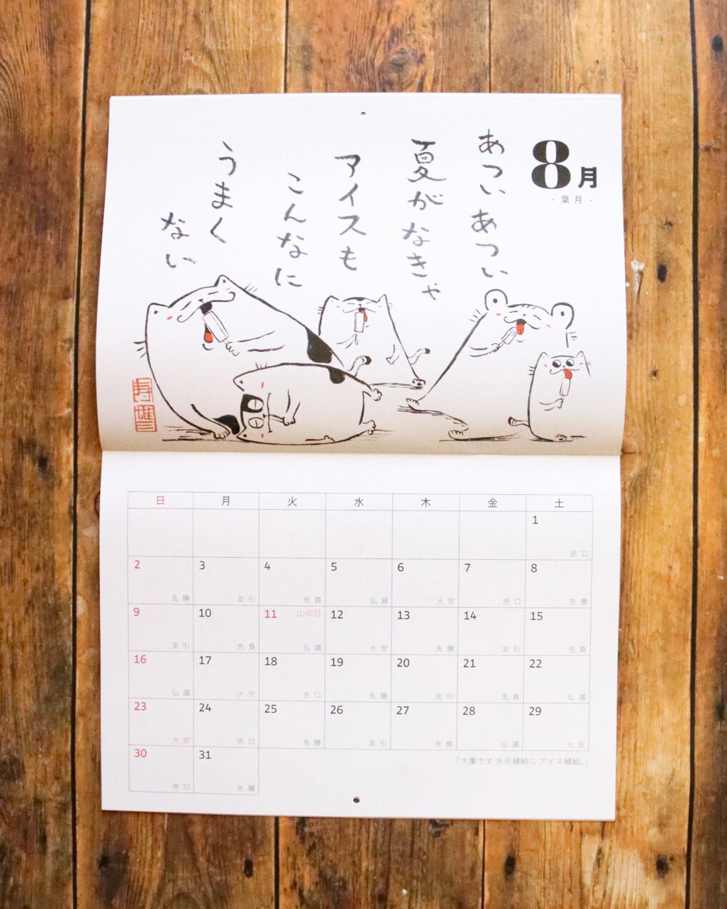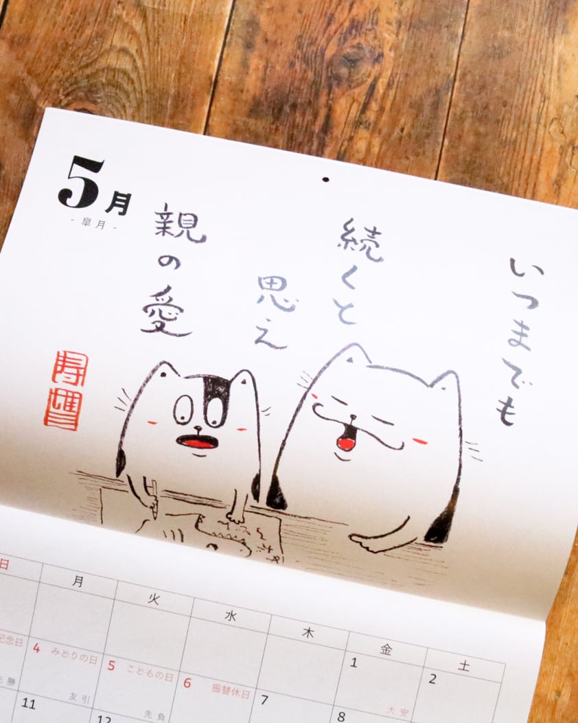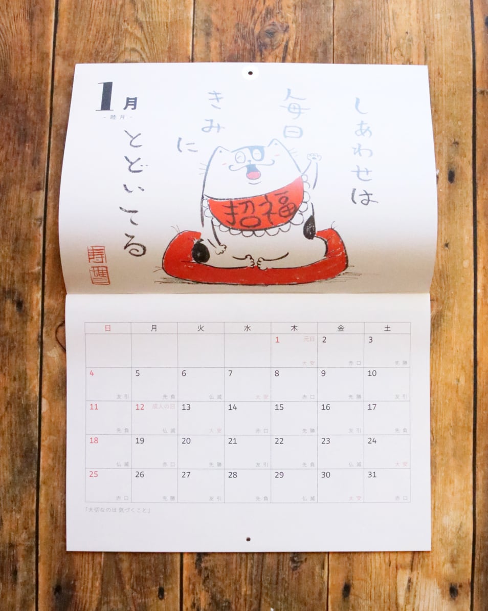 カレンダーの名前の由来はまさに飾って毎日見るものだから、元気が出るものであってほしいということから、毎月楽しいイラストと前向きなメッセージが描かれています。カレンダーの猫たちといっしょに明るい福を呼び込もう。予定も書きこめるので使い勝手も◎