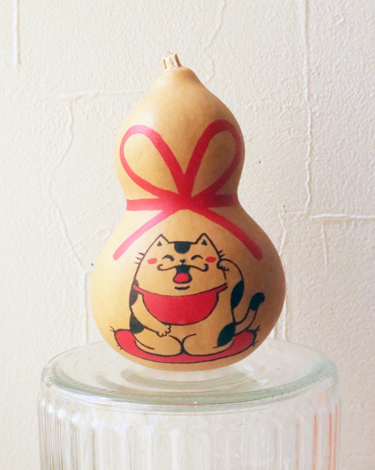 笑顔が可愛い猫のひょうたん、玄関に飾っておくと魔除けになるとか。飾る場所によっていろんな良い運気を呼び込んでくれるようです。