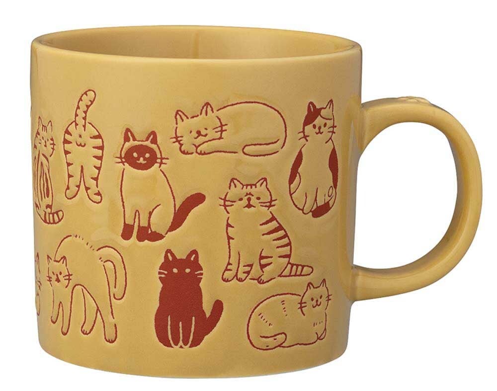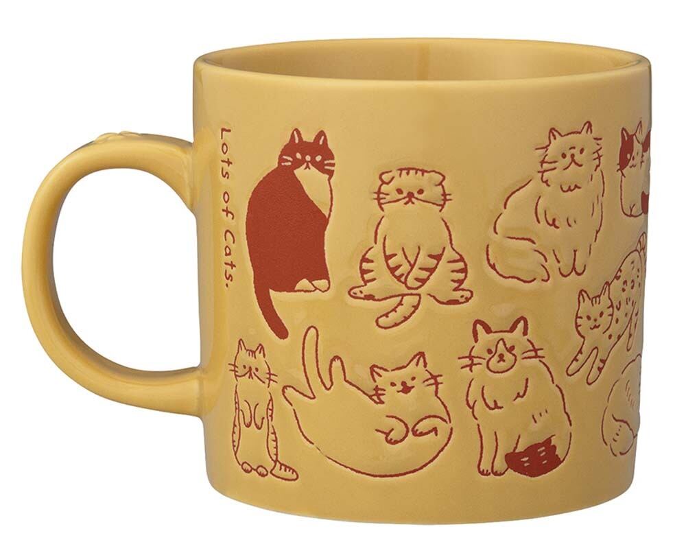猫まみれな撥水絵付けがポイントのマグカップ。ハンドル部分には半立体の肉球がデザインされています。※1個売りです