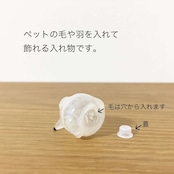 そんな大切な毛を保管できるように、入れ物を作りました。いつもでもフワフワな毛のままで保管することができます。樹脂で出来ているのでガラスより割れにくく安心です。いつまでもうちの子といっしょに!