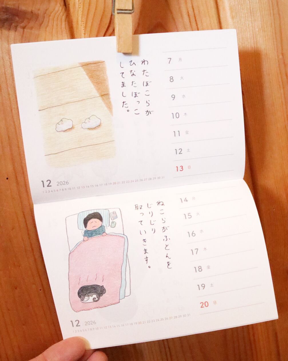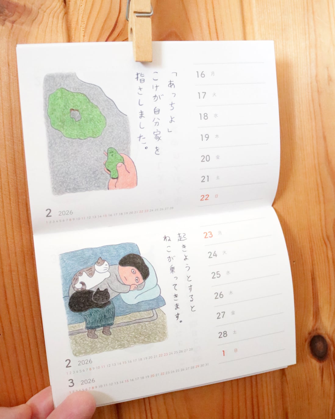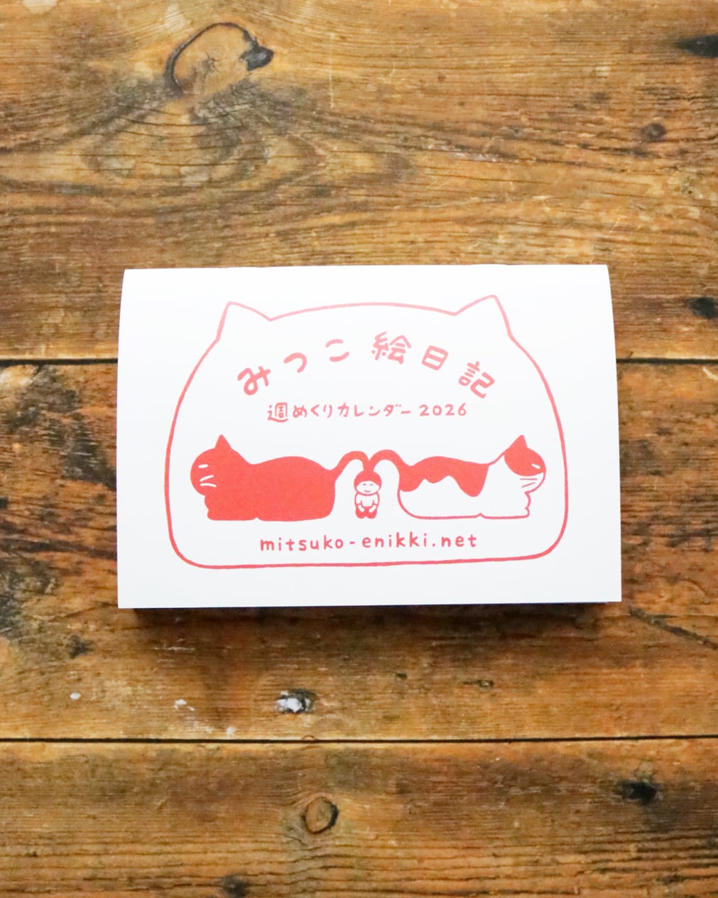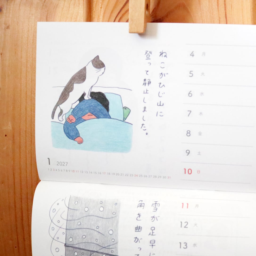 絵本作家でイラストレーターの山田美津子さんがWEB掲載している「みつこ絵日記」から選んだ絵と文が週めくりで楽しめる2026年カレンダー。猫メインではありませんが、日々の暮らしを独自のユニークな目線で切り取って、ゆるいイラストとつぶやきが綴られています。