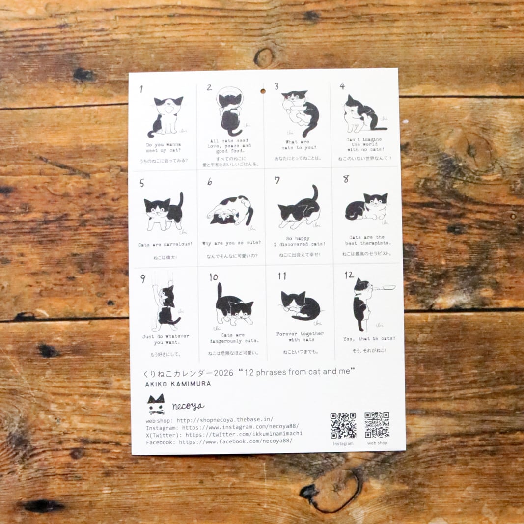 “ねこあるある”の色んなポーズのくりちゃんの絵にねこへの言葉が英語で一文ずつ添えられています