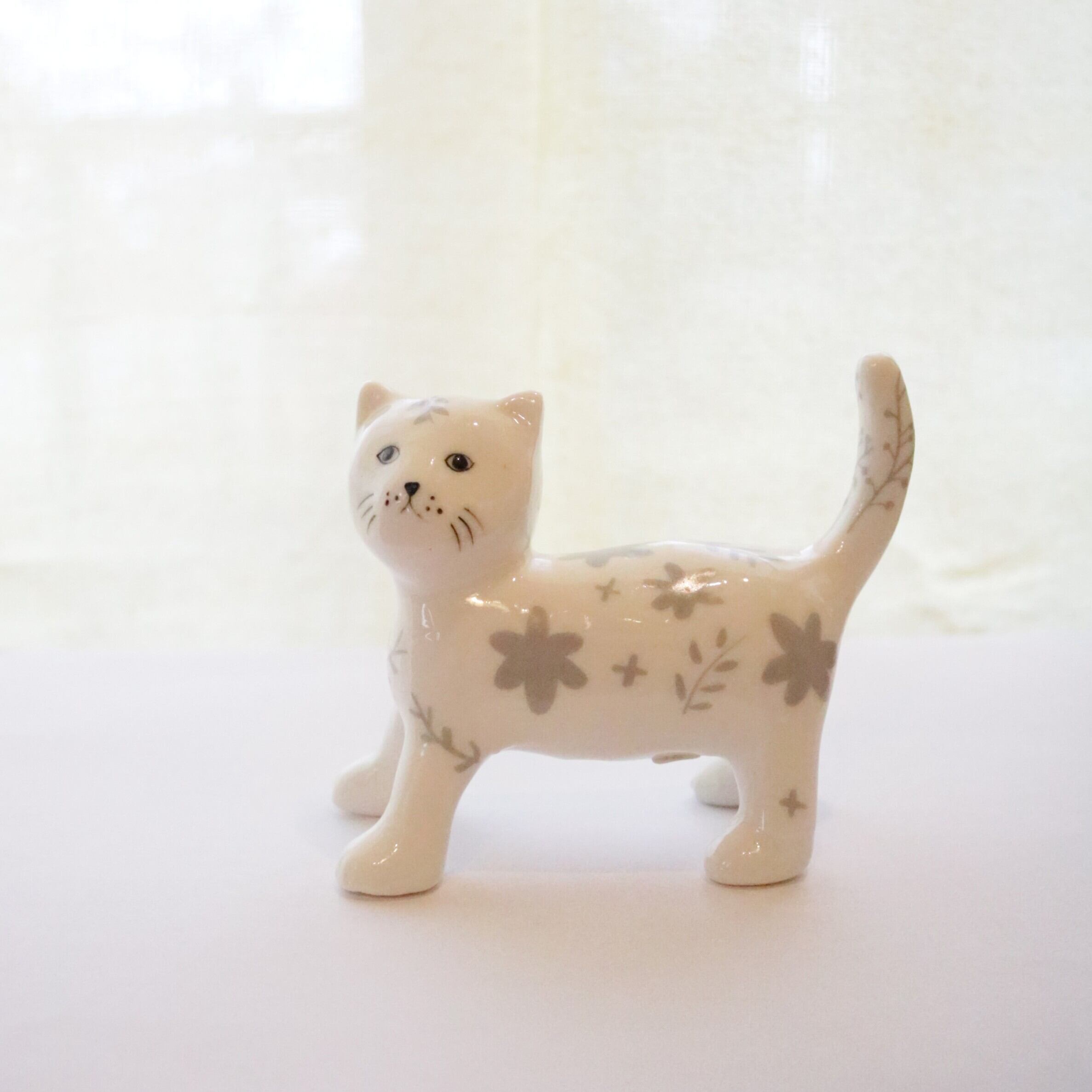 愛らしい花柄をまとった磁器製の猫のリングホルダーです。