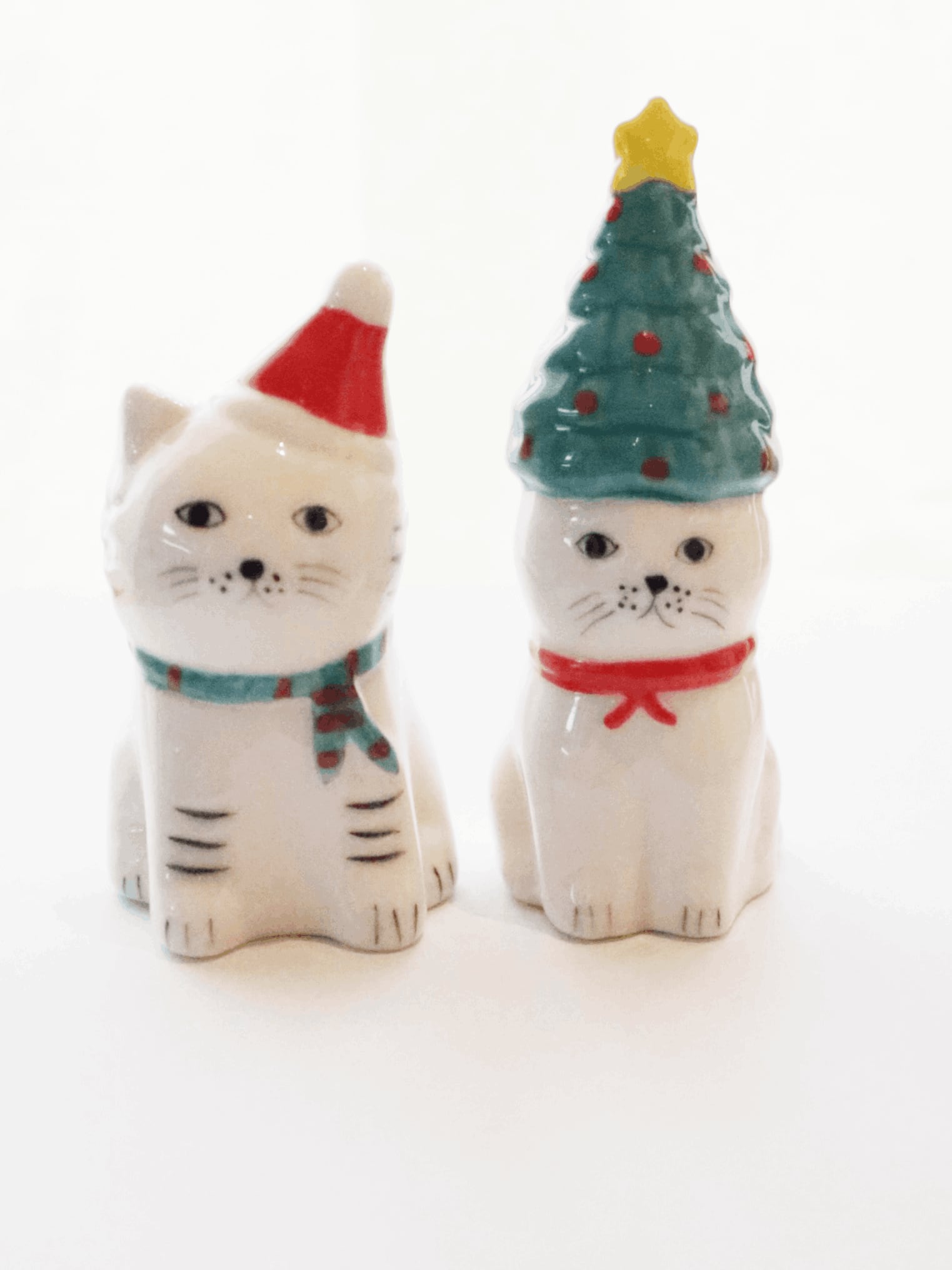 頭にクリスマスツリーをのせた猫と、サンタ帽をかぶった猫が、すました表情でちょこんと佇む姿は、見ているだけで心が和みます。リビングや玄関、デスクなど、ちょっとしたスペースにも飾りやすいサイズで、季節のインテリアとしてさりげなくクリスマス気分を演出できます。