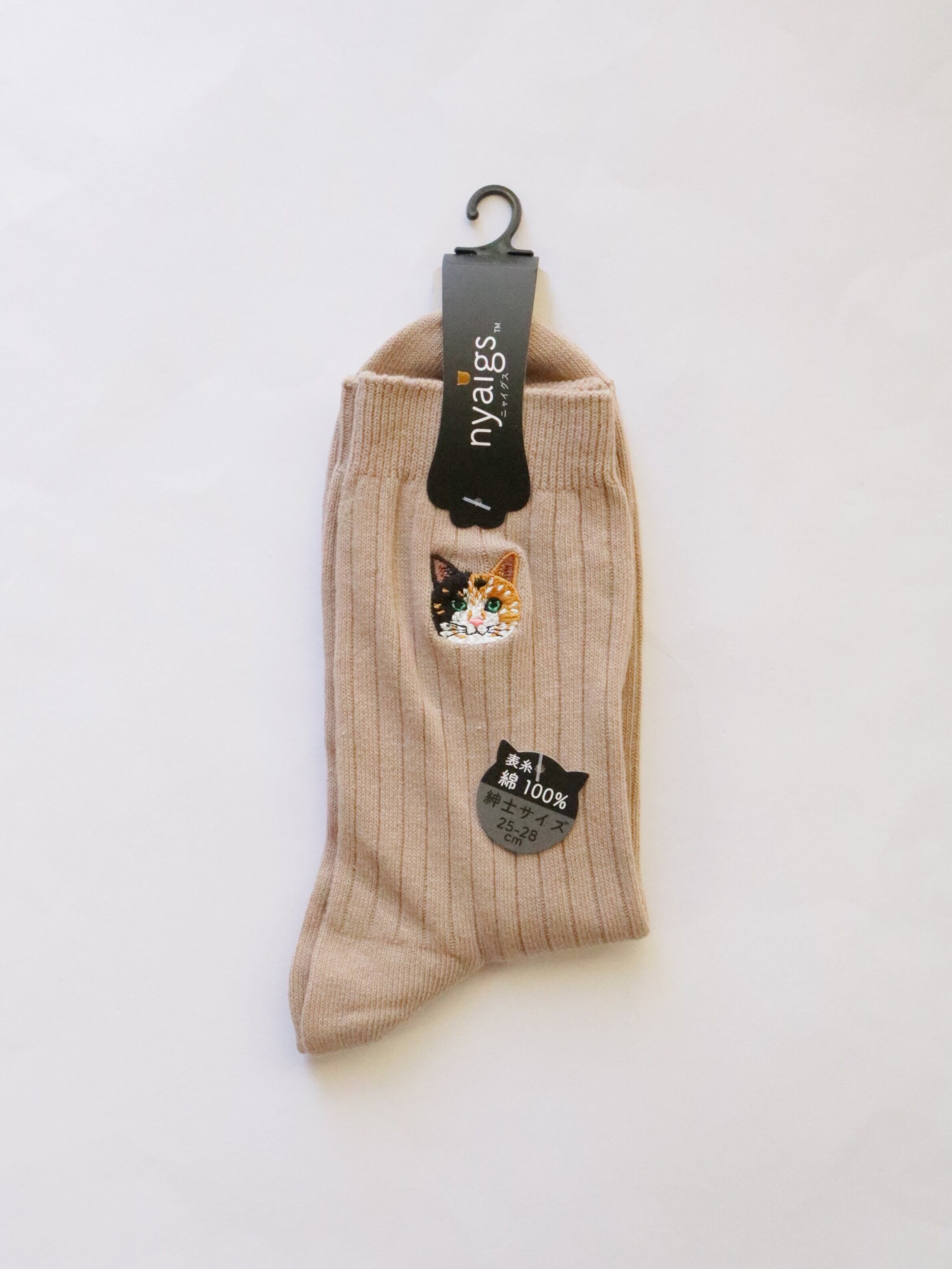 “ねこ好きもねこにも、ナイスな、ものたち”nyaigs。どの猫も幸せであるべき"というテーマで制作された靴下。日々私たち猫好きを癒してくれる猫達に恩返しするべく、収益の一部は、動物保護支援活動団体様の活動費として使用されます。