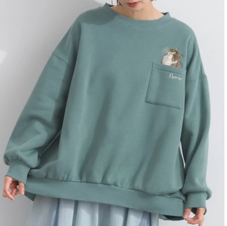 胸ポケットからひょっこり顔を覗かせる猫の刺繍が可愛い裏起毛ビッグプルオーバー。