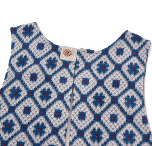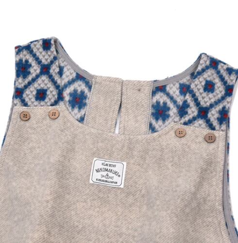 フリース素材のエプロン。肩のたすきの切り替えをアクセントにして、後ろ全体をプリント柄にしました。前後でイメージがガラリと変わるデザインです。