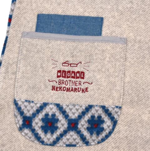 まるでジャガード織りが入ったかのような味わいがあるフリース。配色のプリント柄はセーターのイメージを思わせるあたたかなモロッコ風の柄をプリントで表現しました。ポケットにはカラフルな眼鏡でよそいき気分のネコまるけのアップリケで飾りました。
