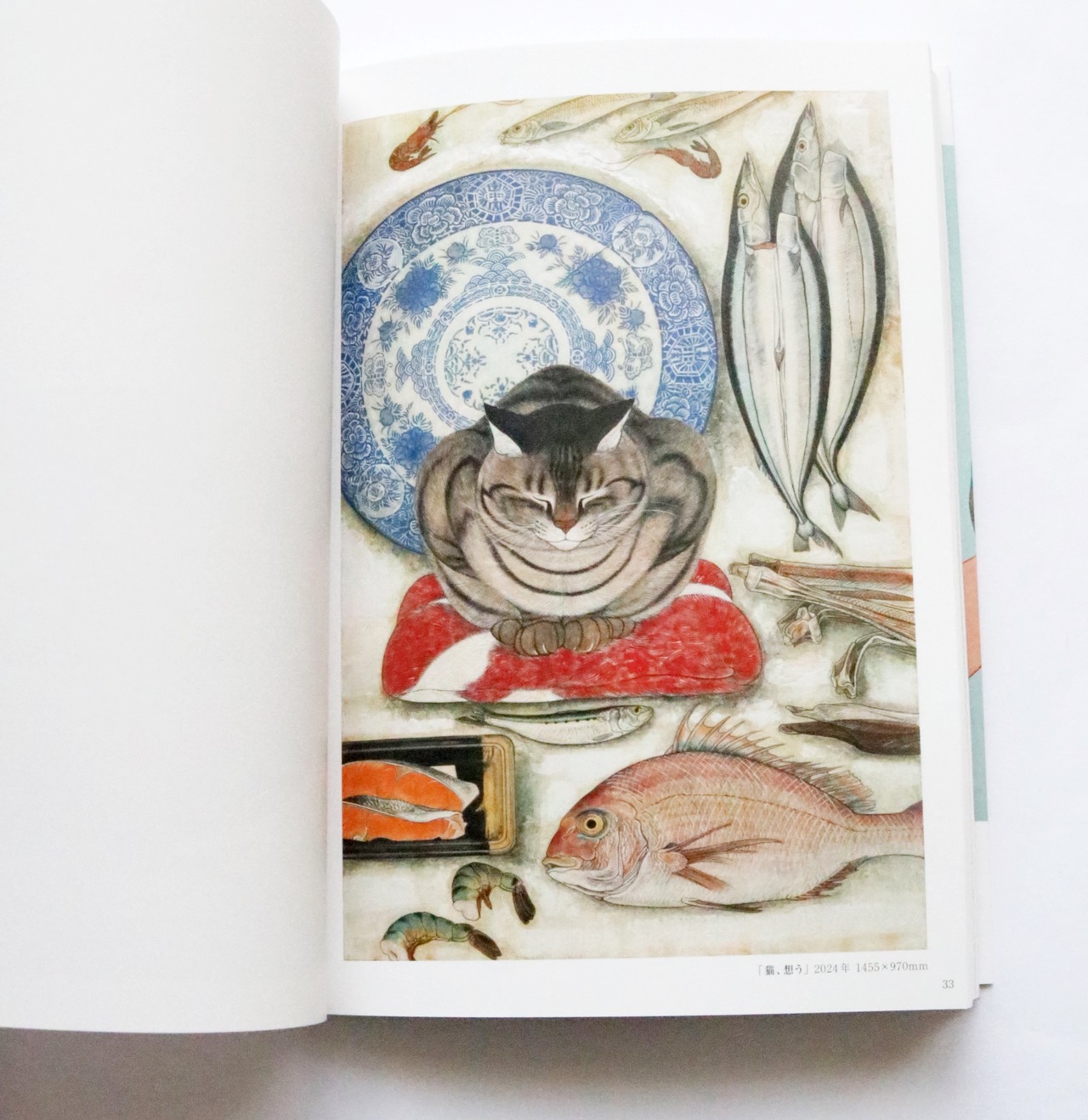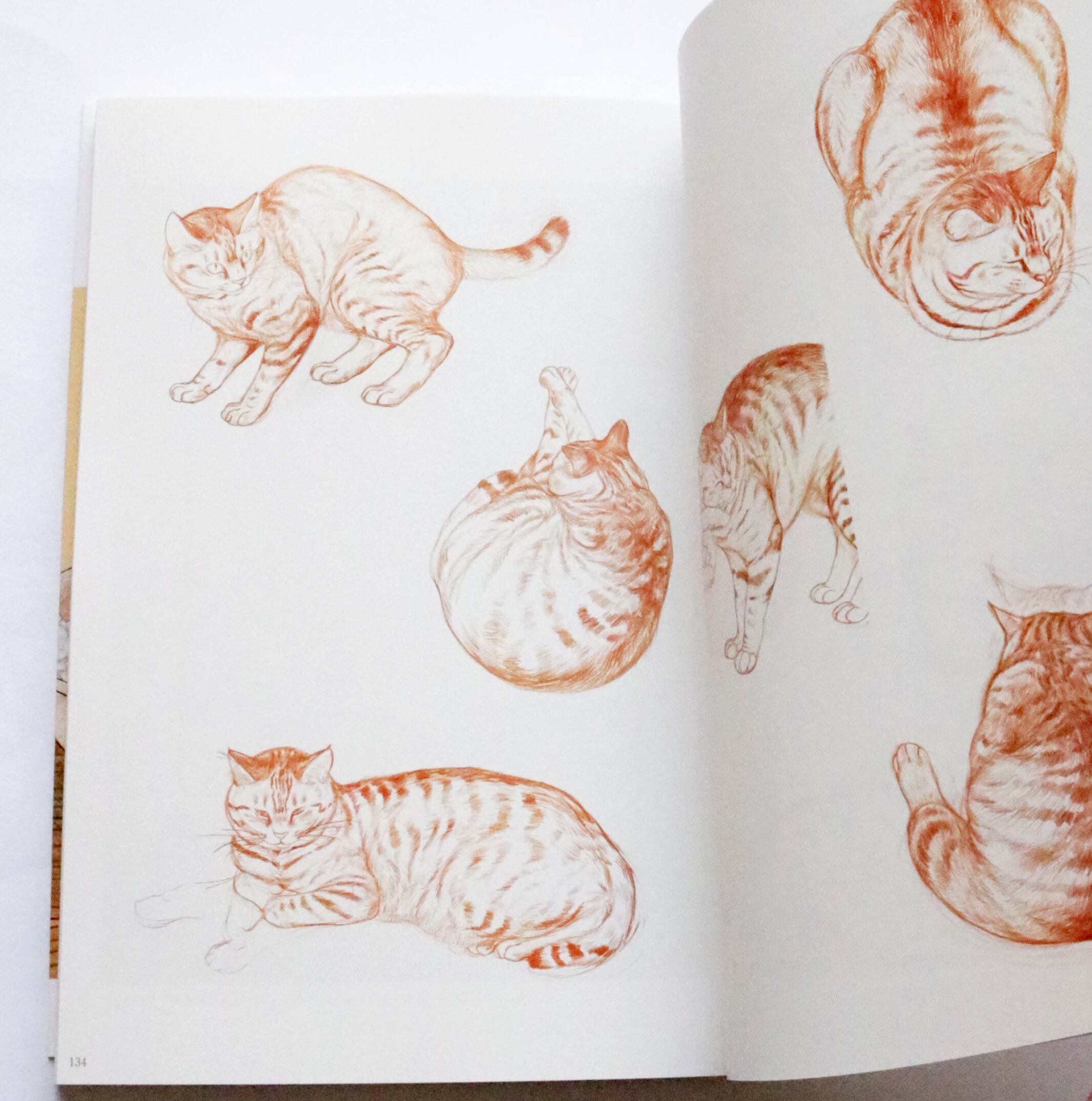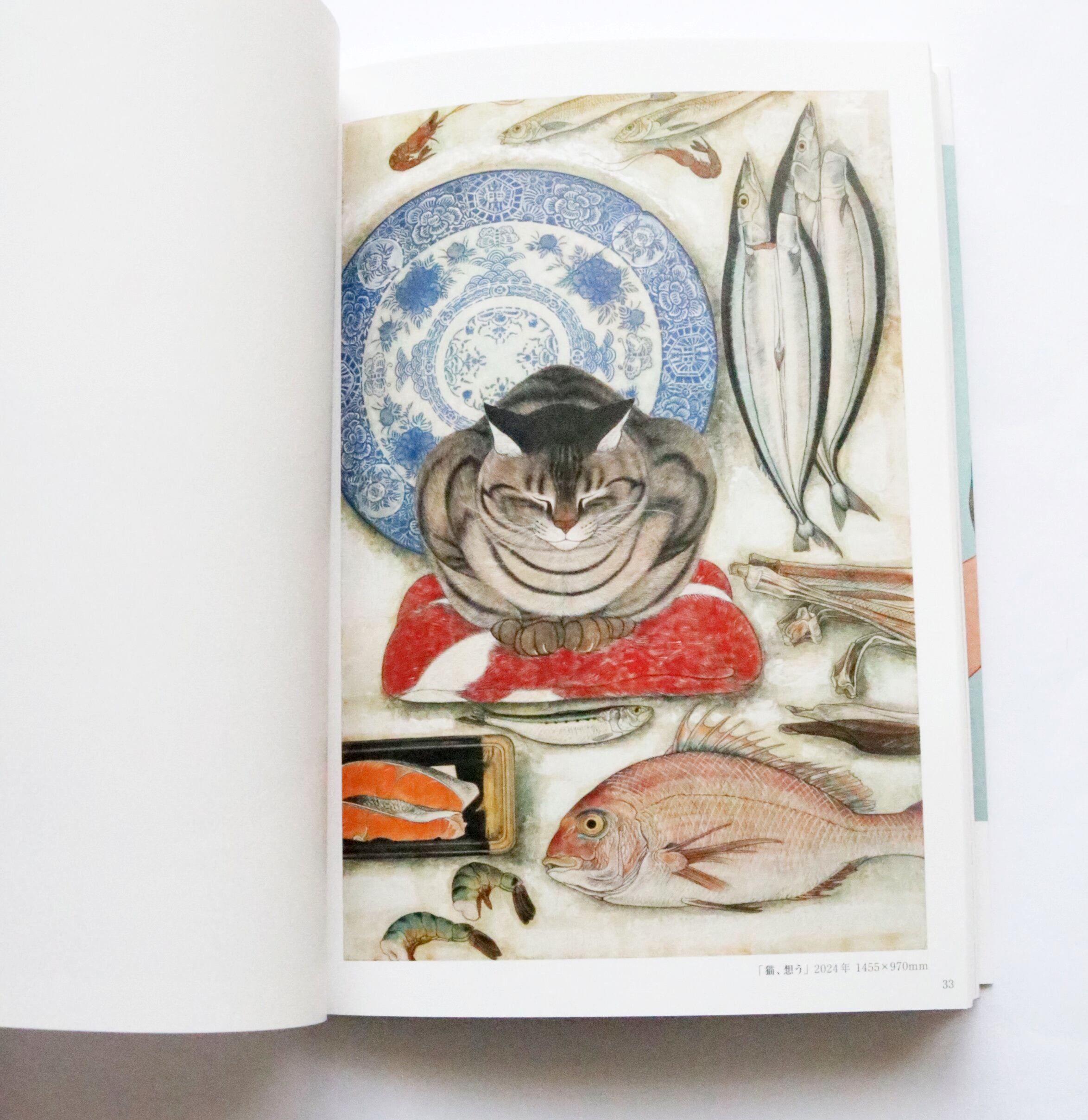 写真を参考に描くことはせず、観察に観察を重ねて描かれたコイモは今にも動き出しそうな躍動感にあふれています。毛の1本1本までが精緻に描き込まれた姿からは、ふんわりとした毛並みやもっちりとした肉感を感じ取れるほど。コイモとの日常を描いた作品をはじめ、桜やたんぽぽなどの花々に囲まれ、昆虫と戯れるコイモを描いた幻想的な世界観の作品、野菜や果物、庭で咲いた花々や近所の漁港に上がった魚たちのスケッチなど、約120点を収録。