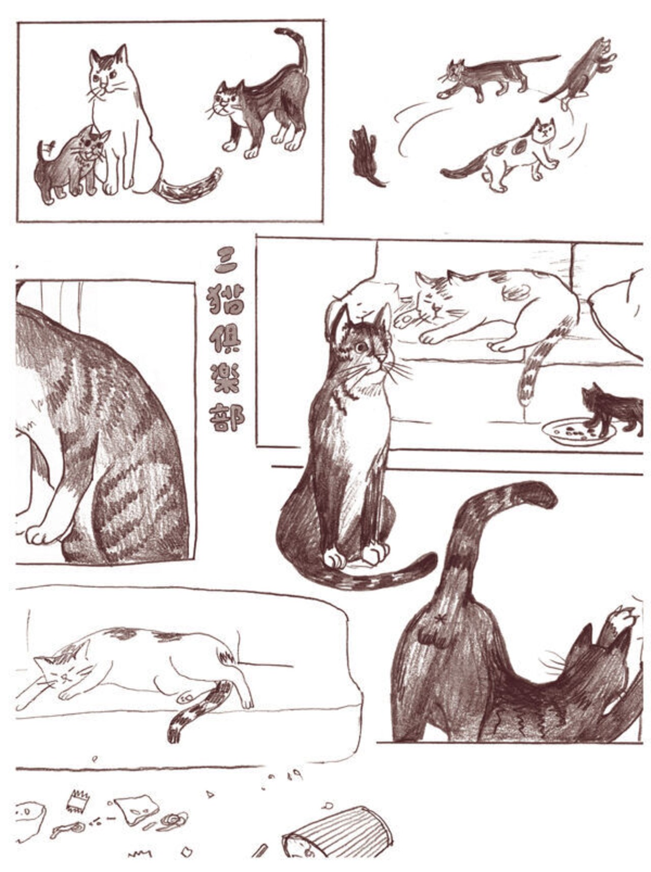 ミーザイさんやルームメイトが拾って飼い始めた三匹の猫が “三猫倶楽部”を結成。にぎやかで愛らしい日々がページのあちこちに広がっています。原作の雰囲気をそのまま感じていただけるよう、できるだけ忠実に翻訳しました。
