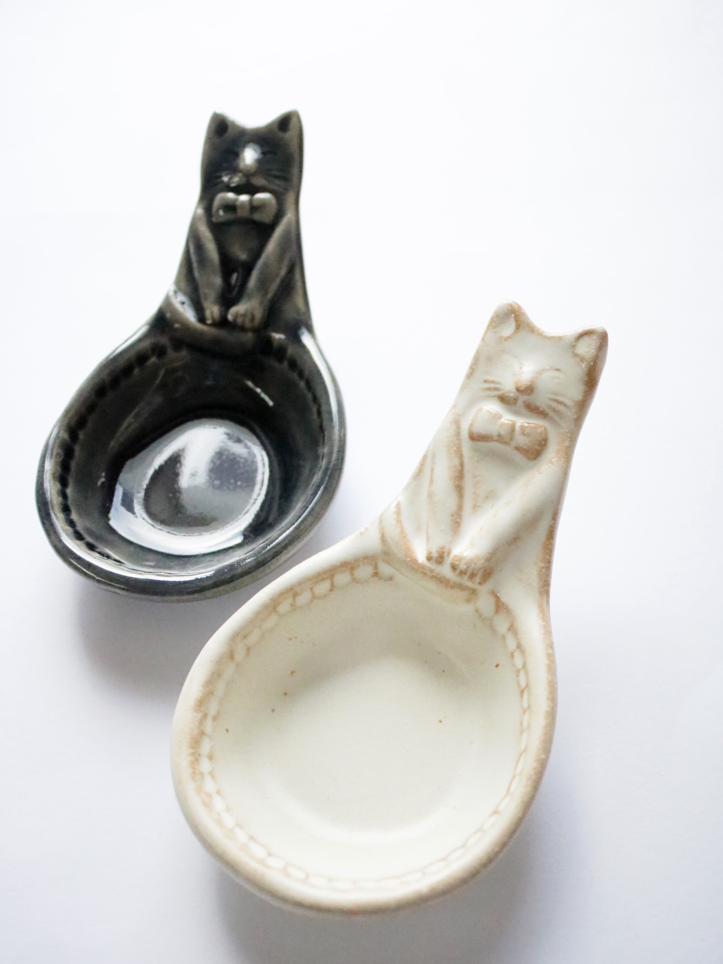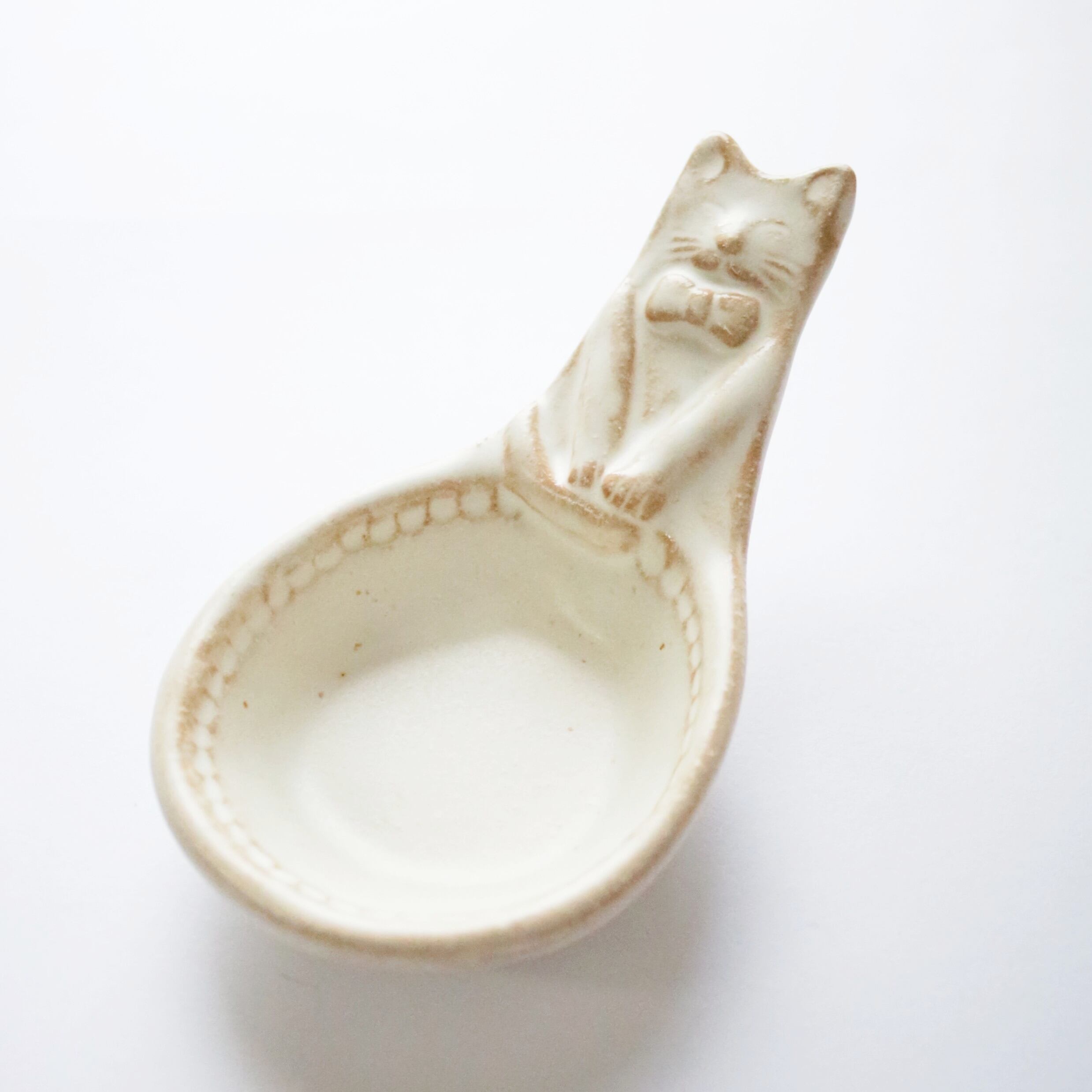 猫の持ち手が可愛い小皿。お皿と組み合わせて食卓のアクセントにも♪グレーと白の2種類です。電子レンジOKなので普段使いも出来て嬉しい。