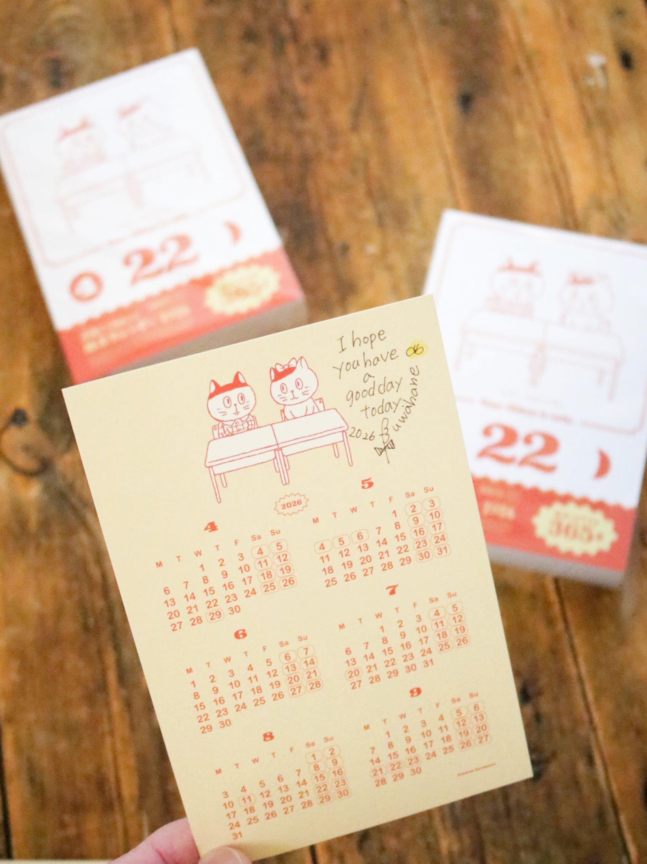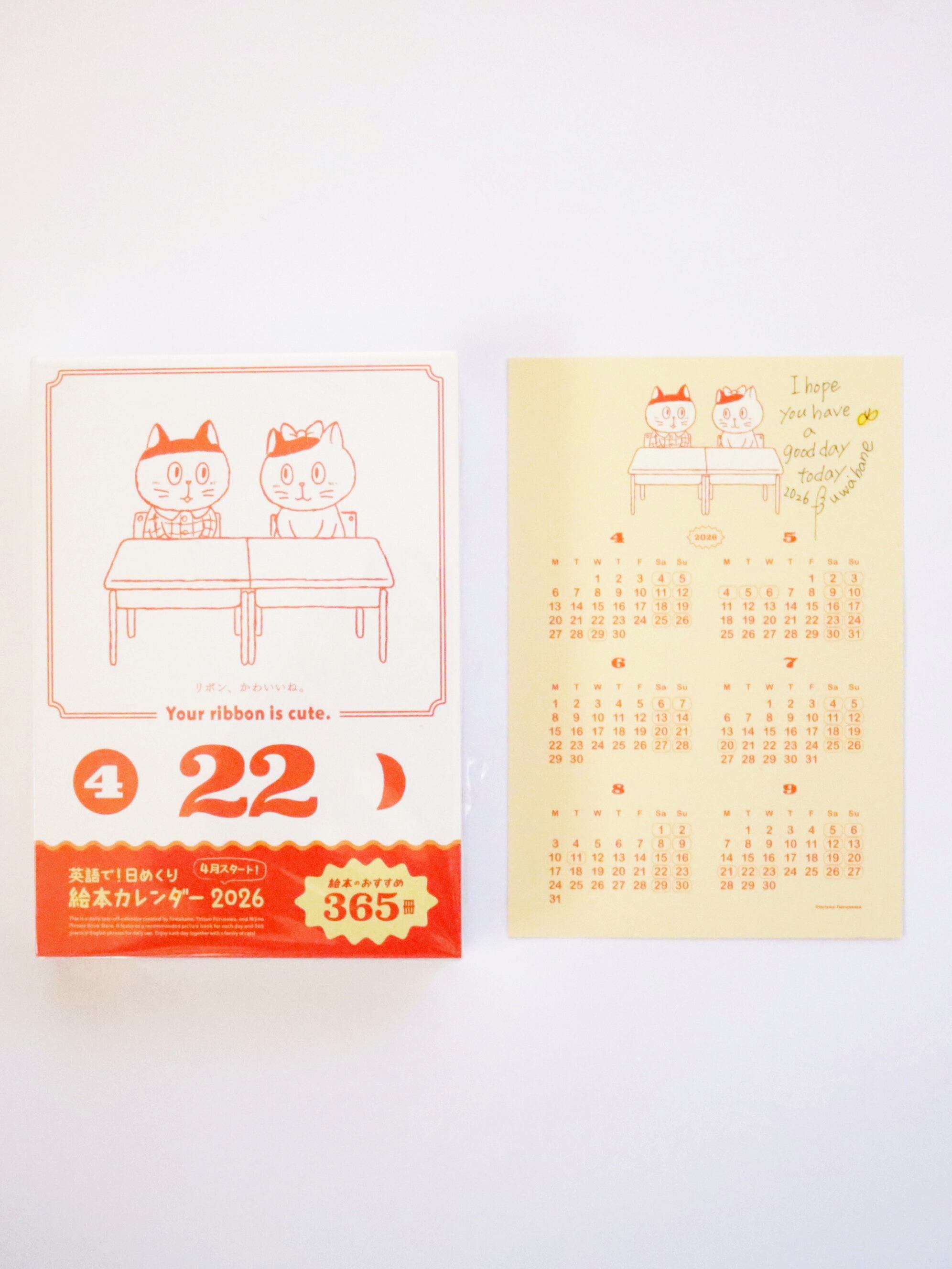 2026年度は、日常で使う英語のフレーズも載せ、英語も学べるカレンダーになりました。絵本作家の古沢たつおさんの描く、猫の家族たちも可愛い1冊。