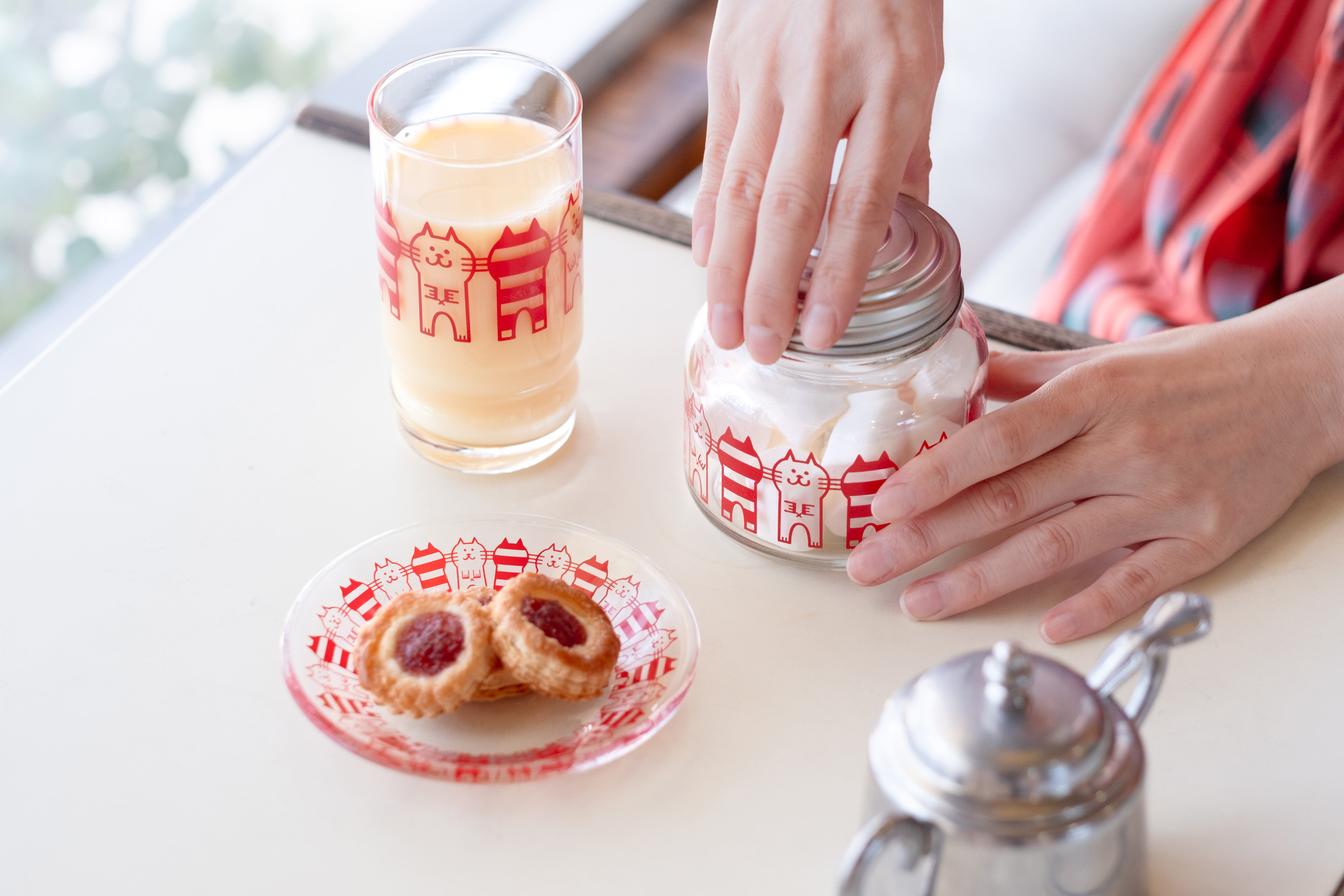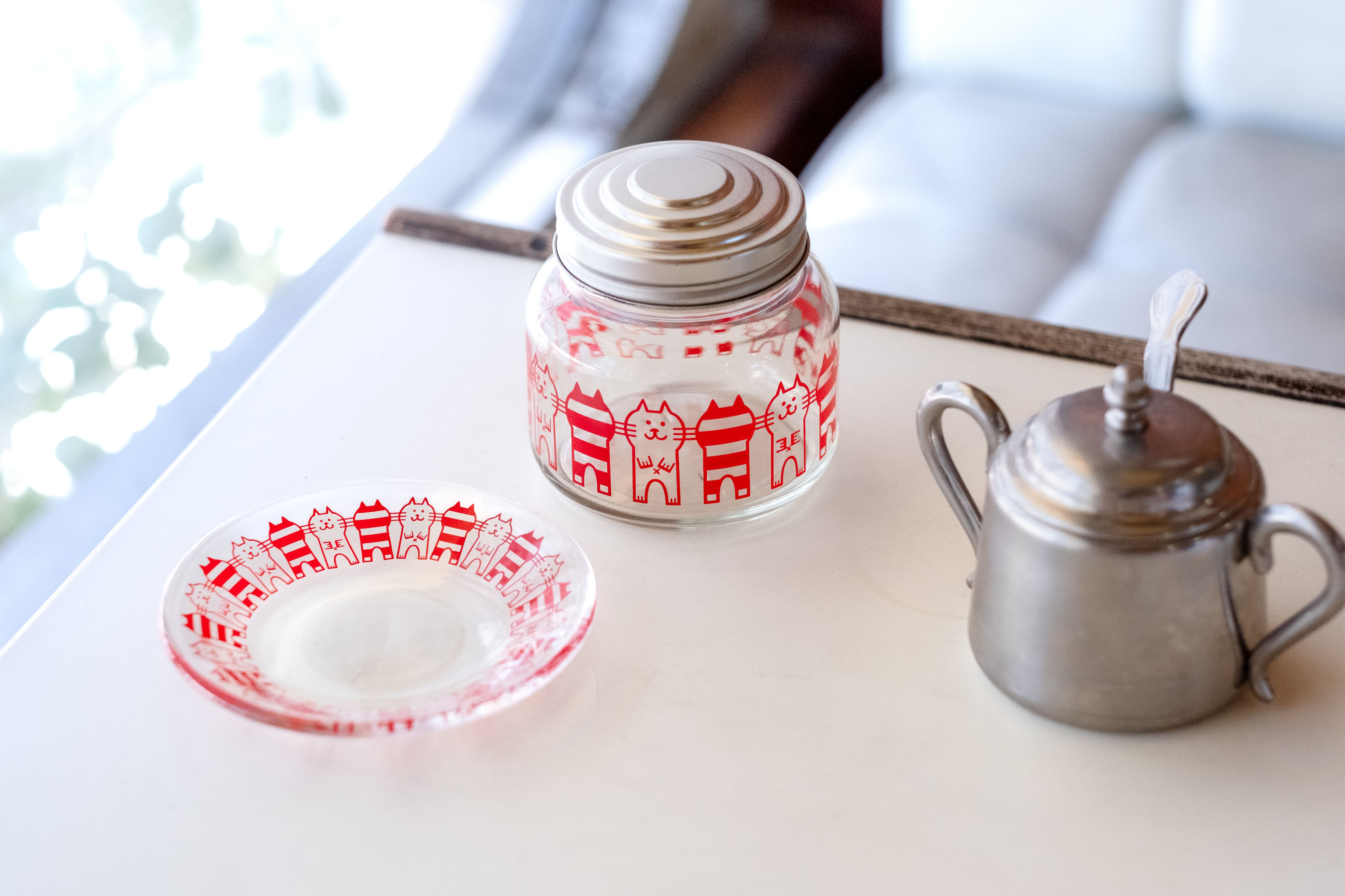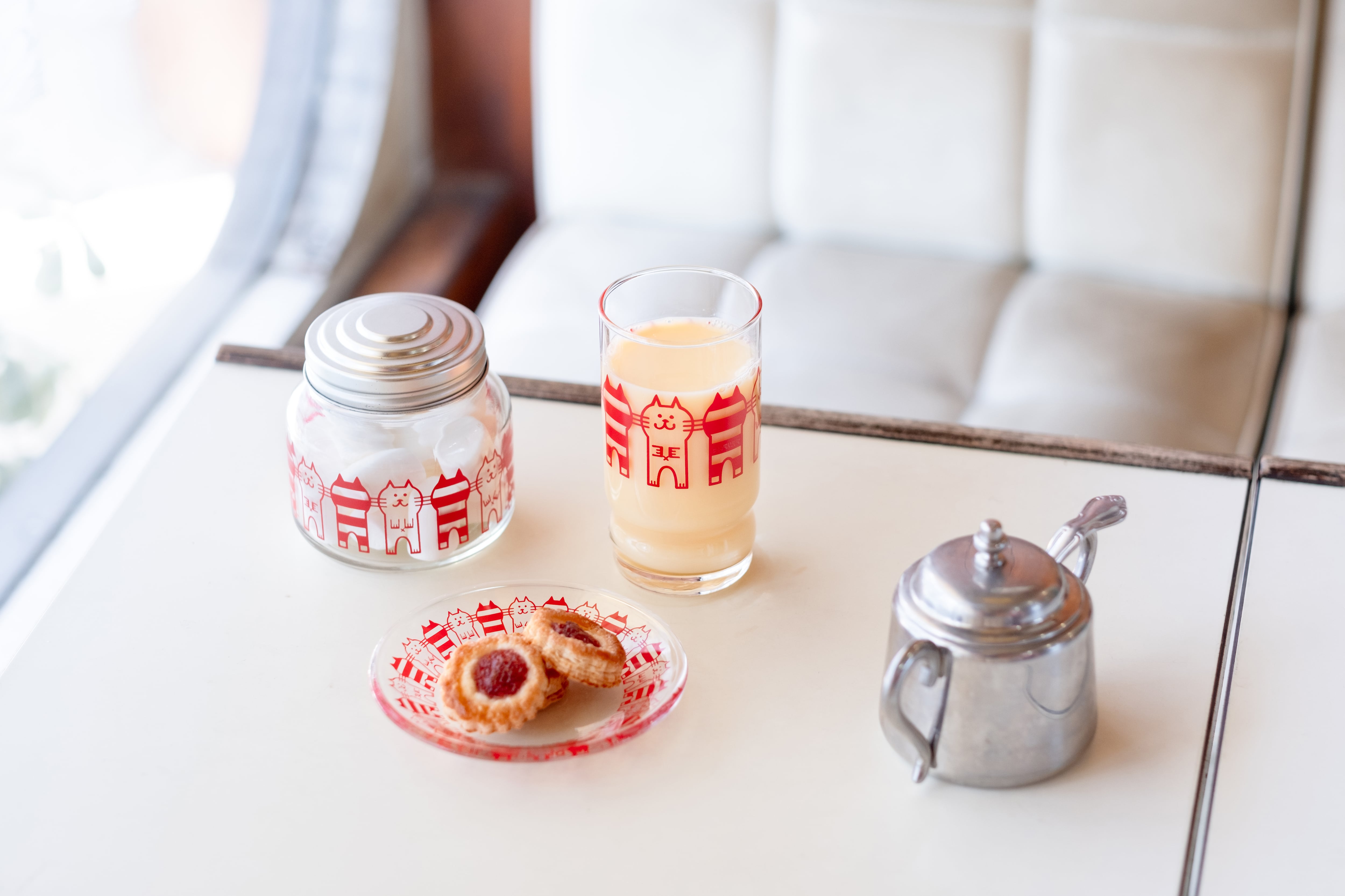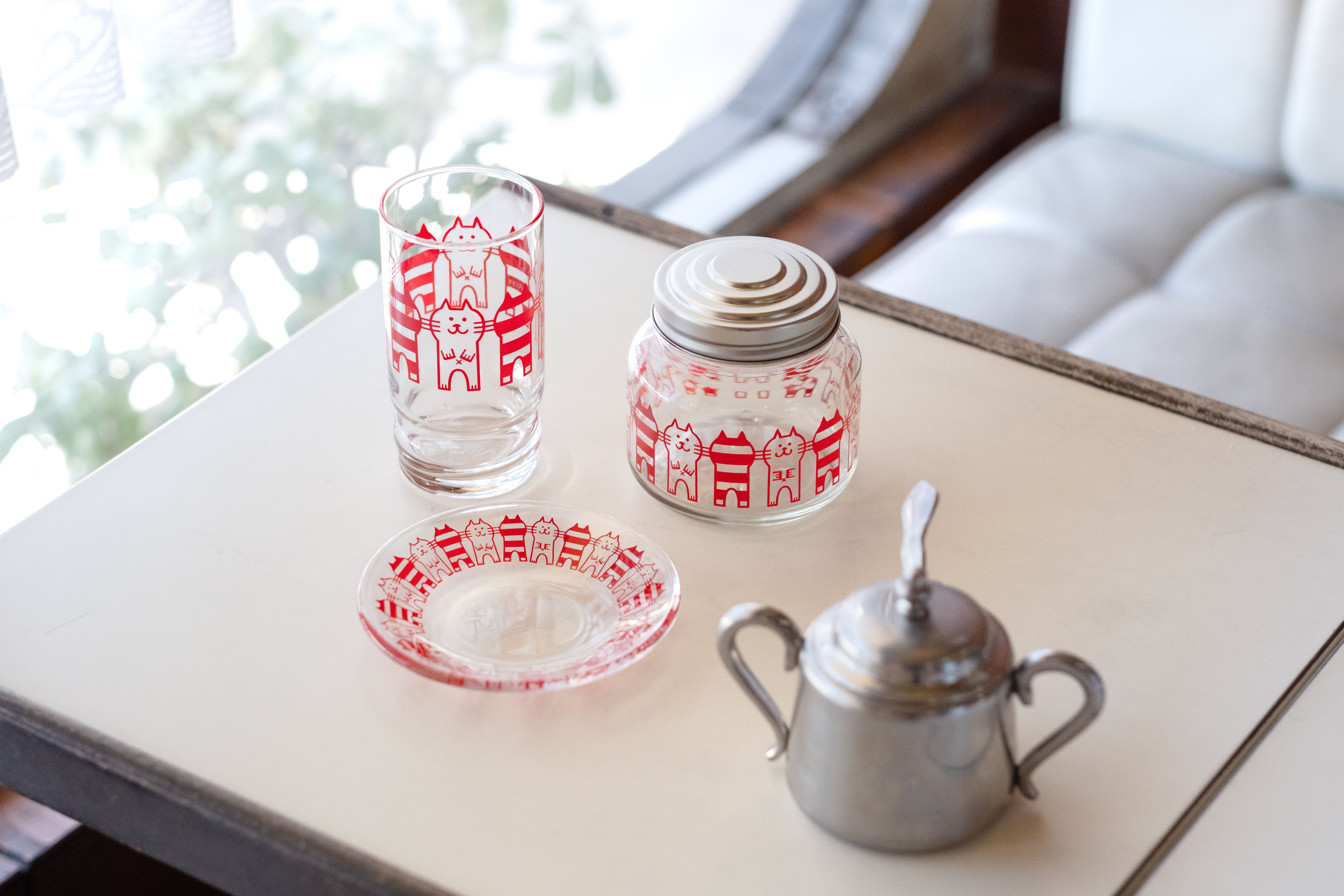 二本足で立ち上がった猫がかわいい「キャット」は昭和45(1970)年に発売された柄です。正面を向いた猫のイラストと、縞模様の猫のシルエットが交互に並んで描かれています。仲良くおヒゲで繋がっている猫たちの姿がとってもキュート。