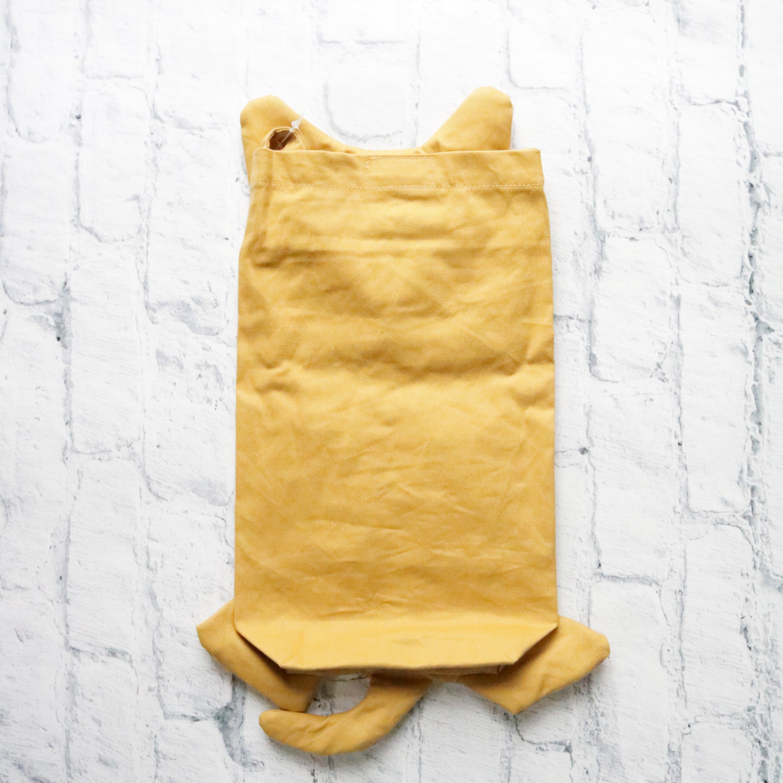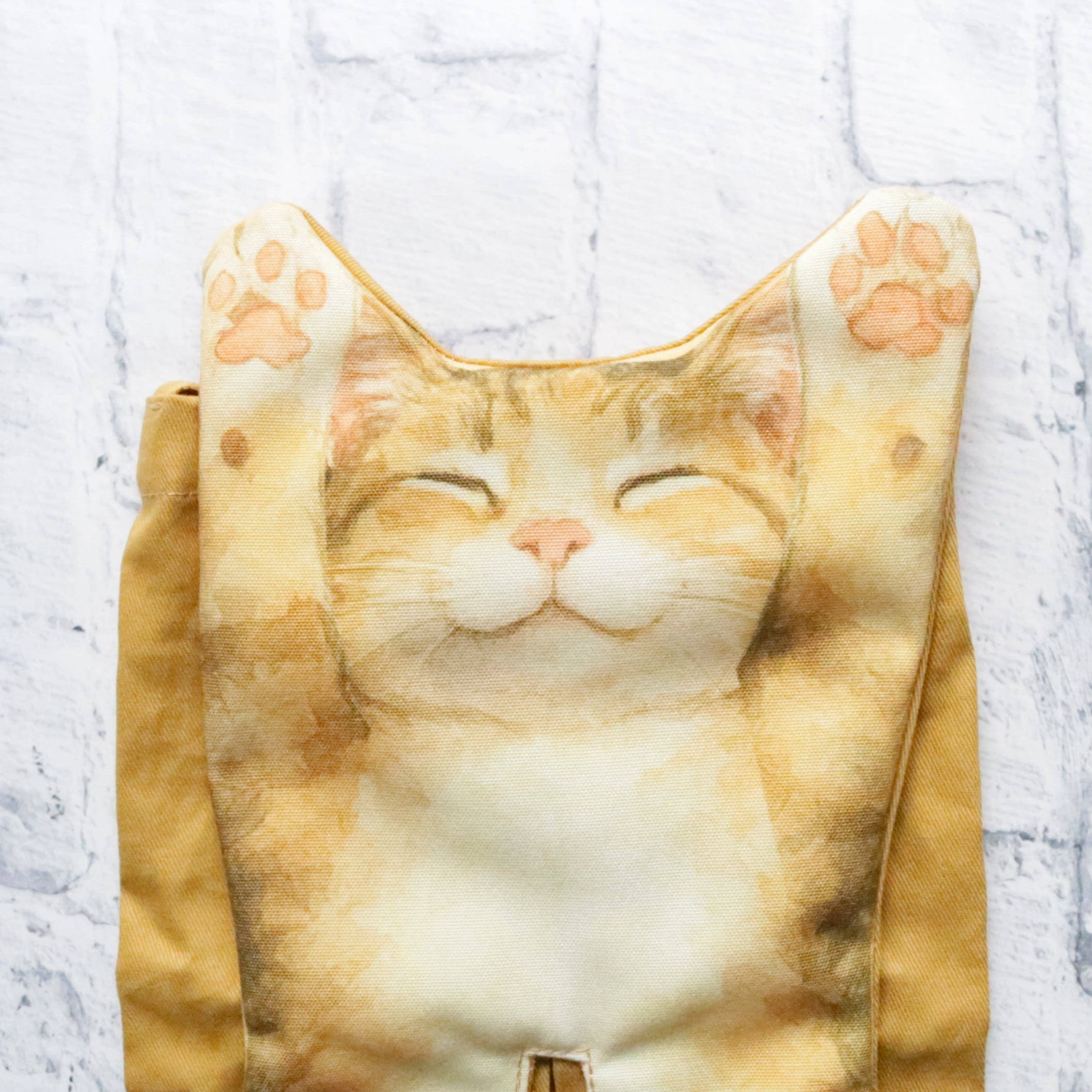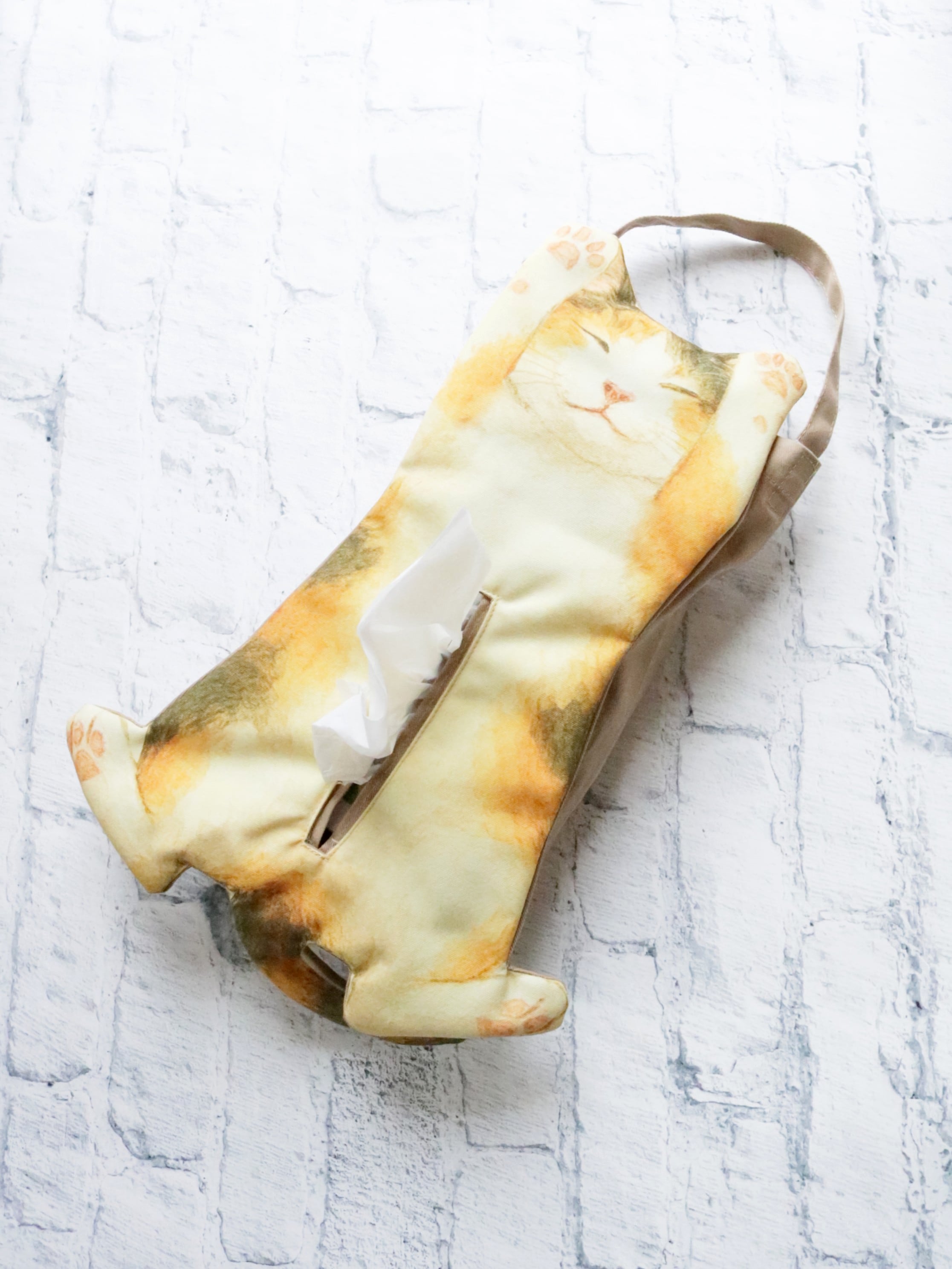 へそ天猫のお腹からティッシュが取り出せるティッシュボックスカバー。ハンドル付きなので吊り下げて使用することもできます。