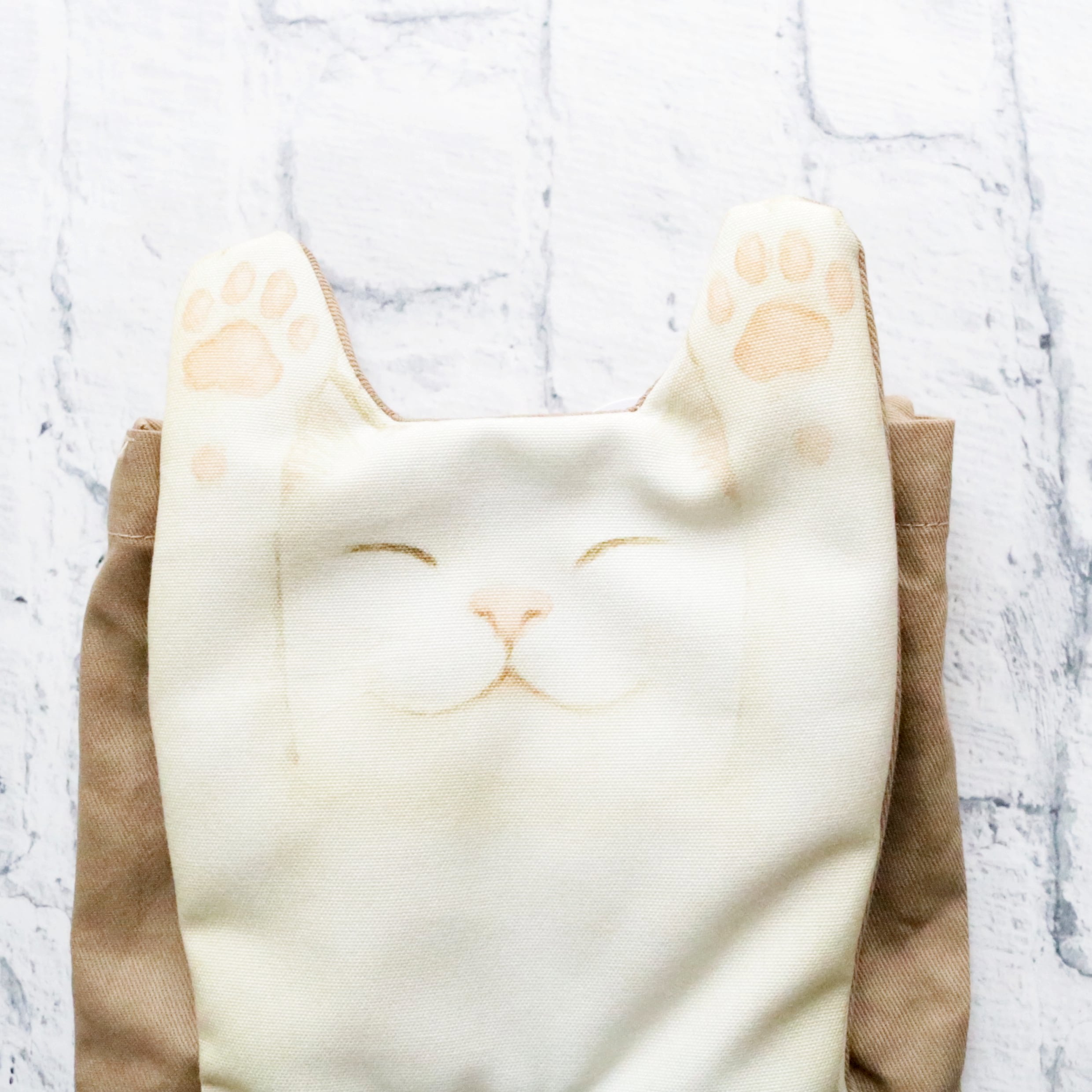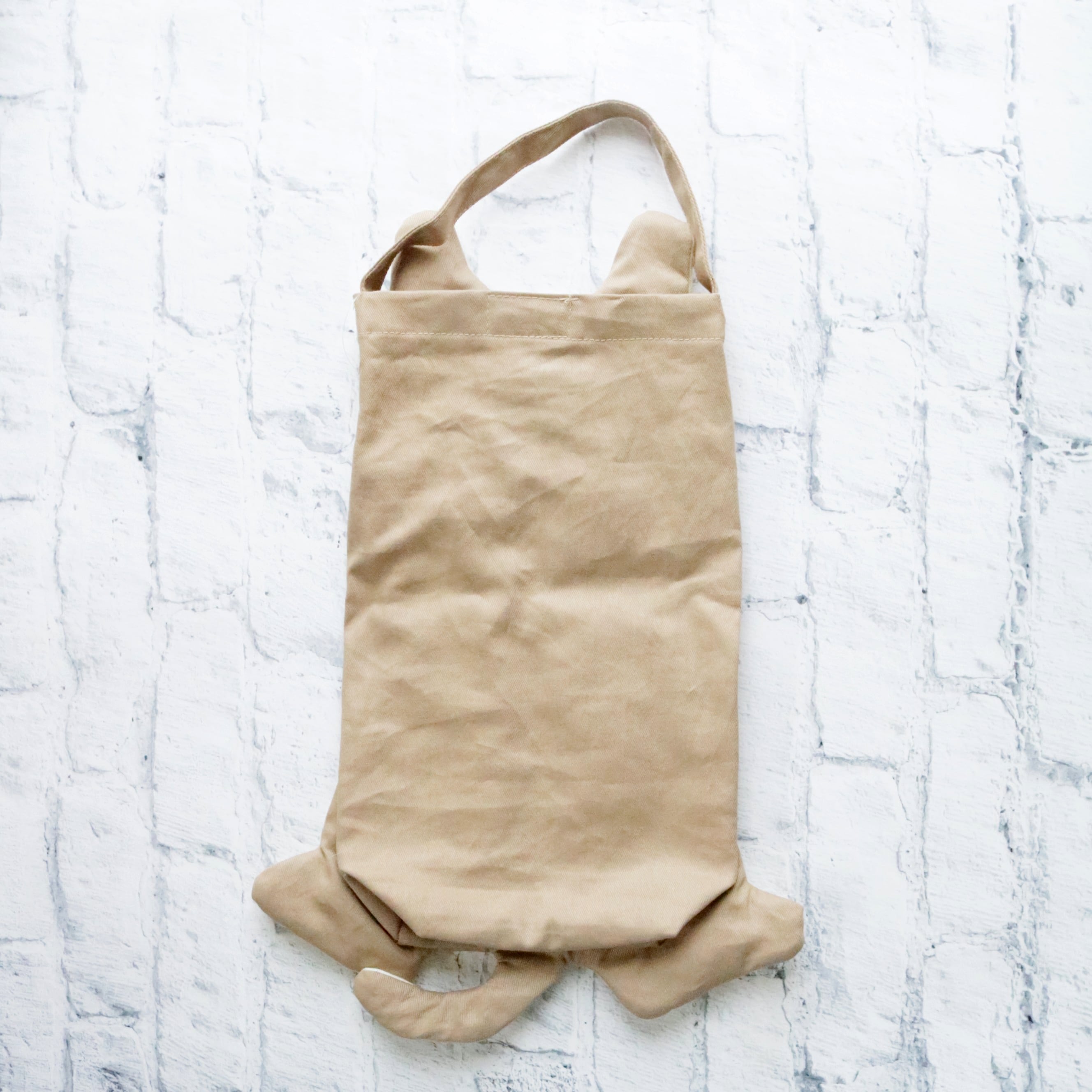 へそ天猫のお腹からティッシュが取り出せるティッシュボックスカバー。ハンドル付きなので吊り下げて使用することもできます。