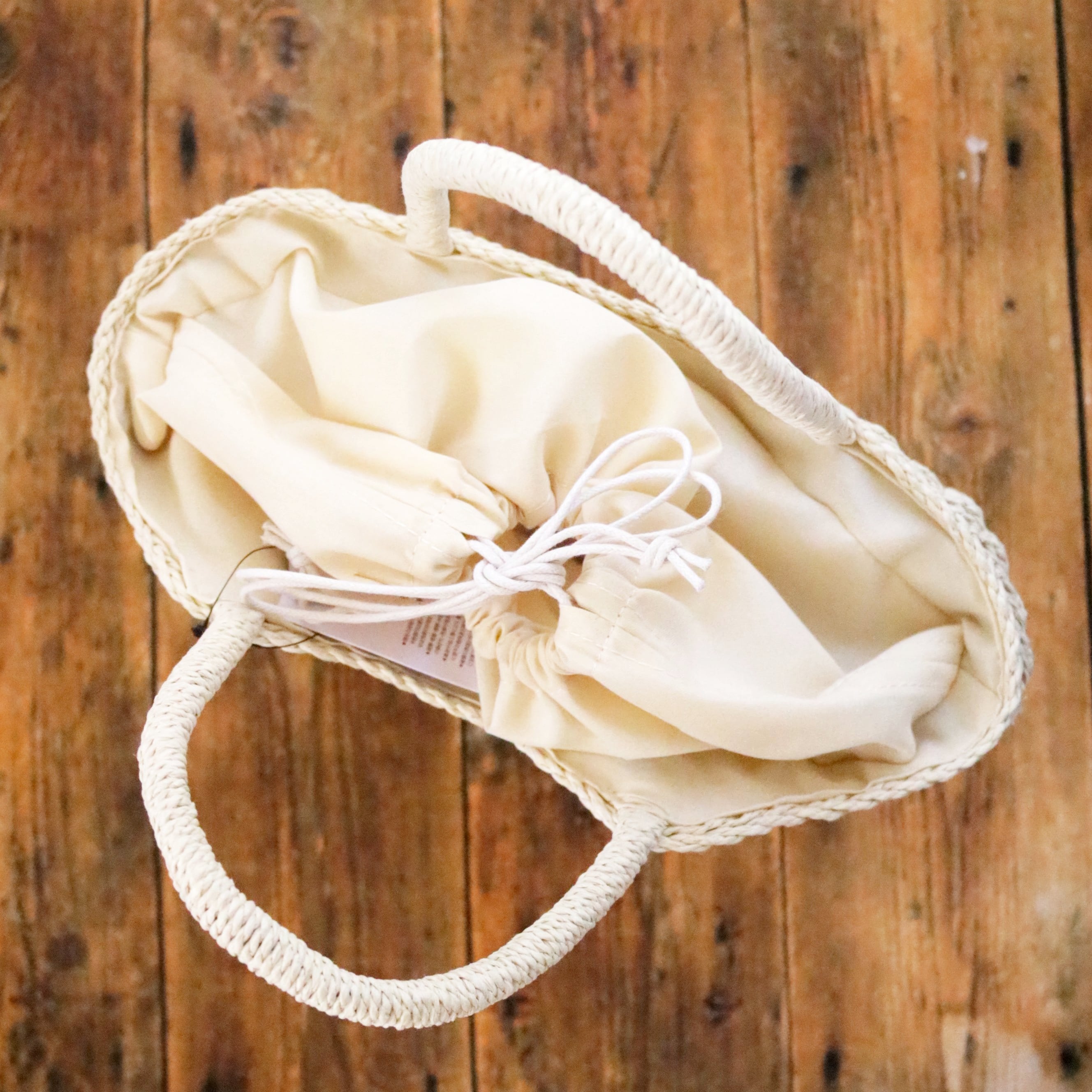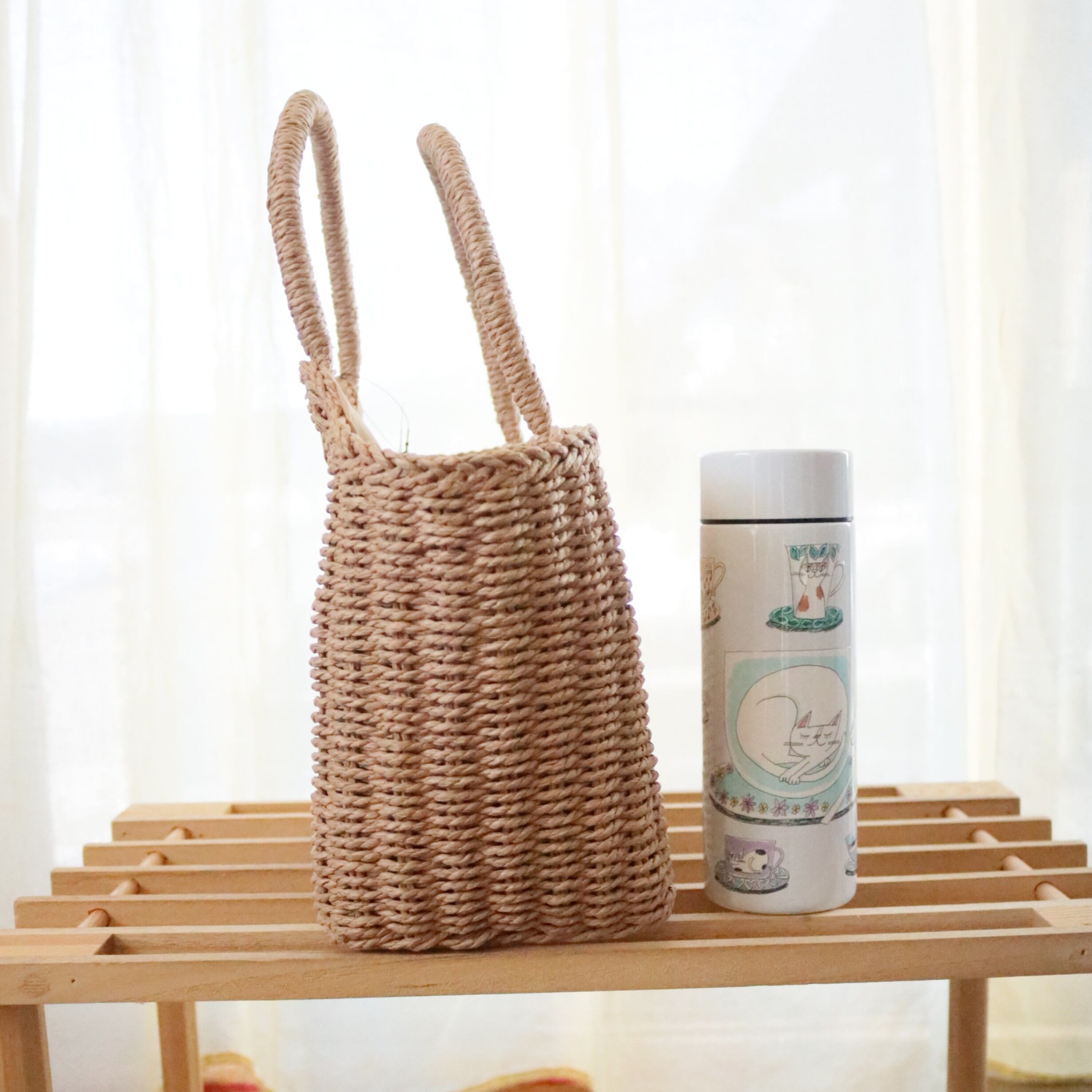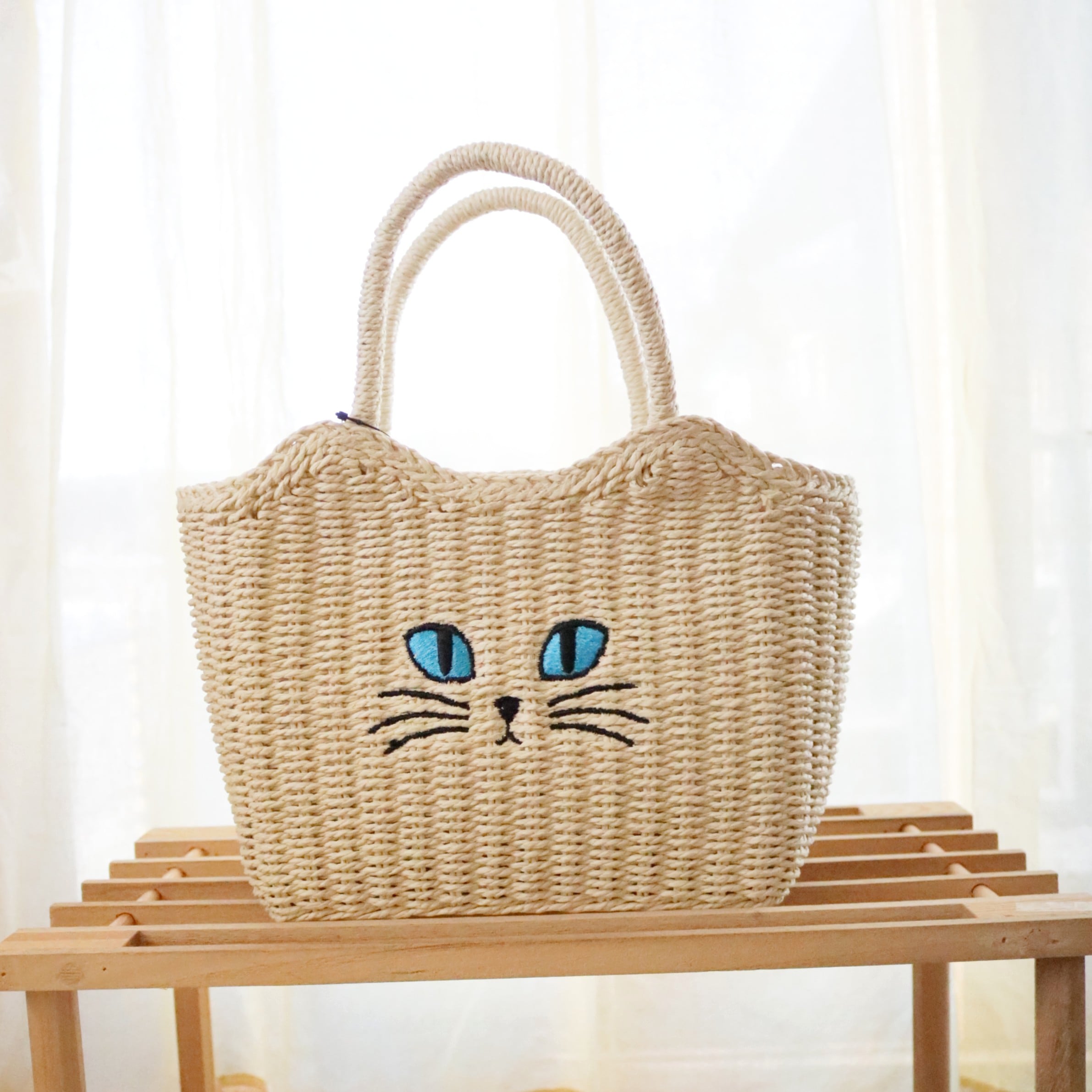 つぶらな瞳のネコがキュートな、かごバッグです。編み地が夏らしい軽やかな雰囲気を演出します。巾着タイプになっているので携帯や財布、水筒など、お出かけに必要なものがしっかりと収まります。