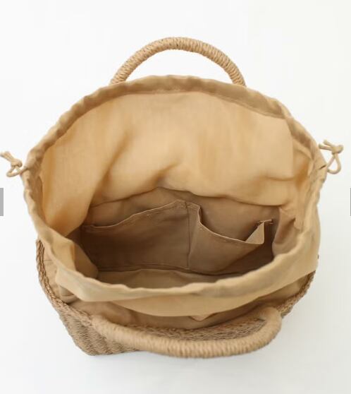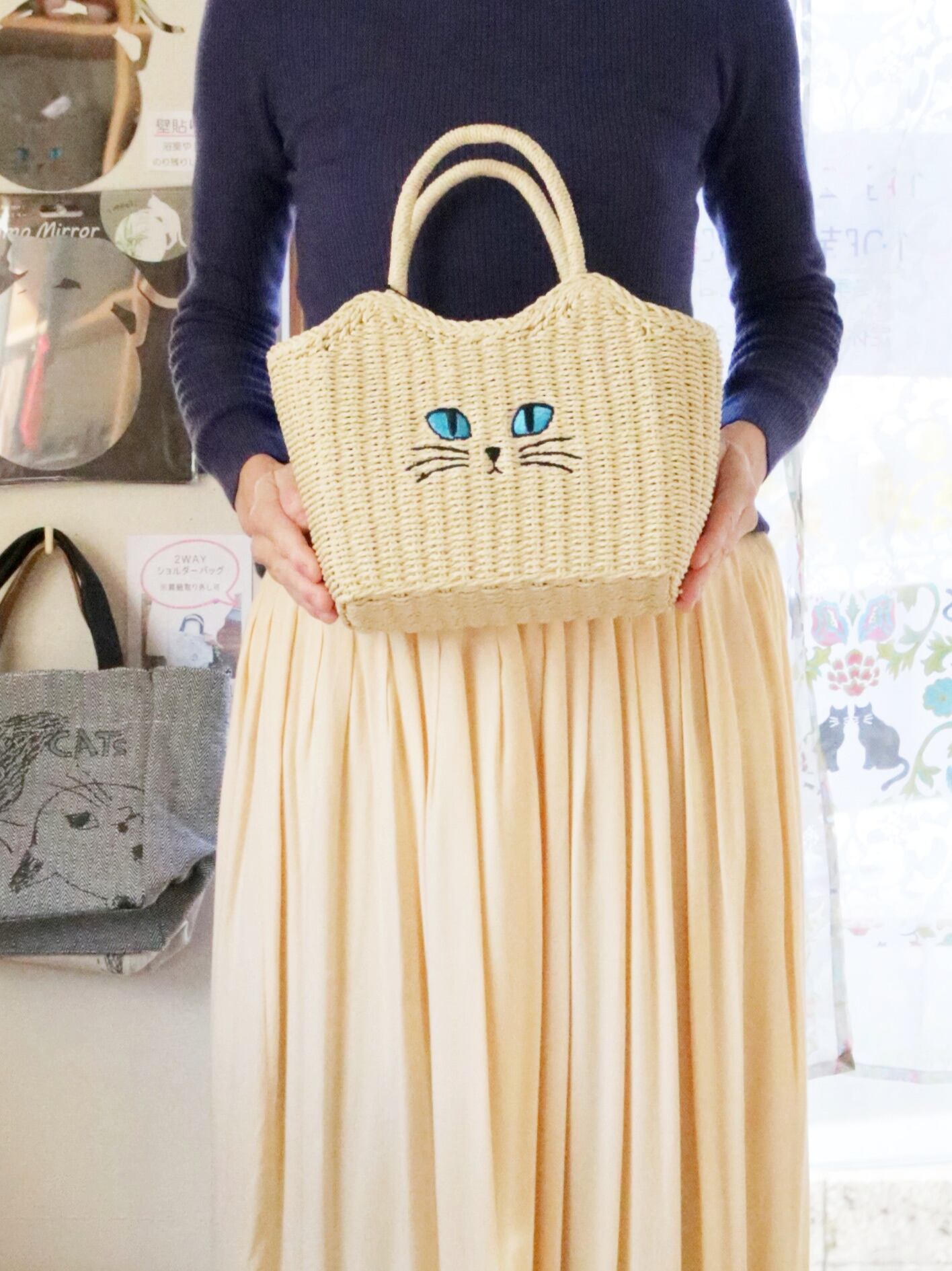 つぶらな瞳のネコがキュートな、かごバッグです。編み地が夏らしい軽やかな雰囲気を演出します。巾着タイプになっているので携帯や財布、水筒など、お出かけに必要なものがしっかりと収まります。
