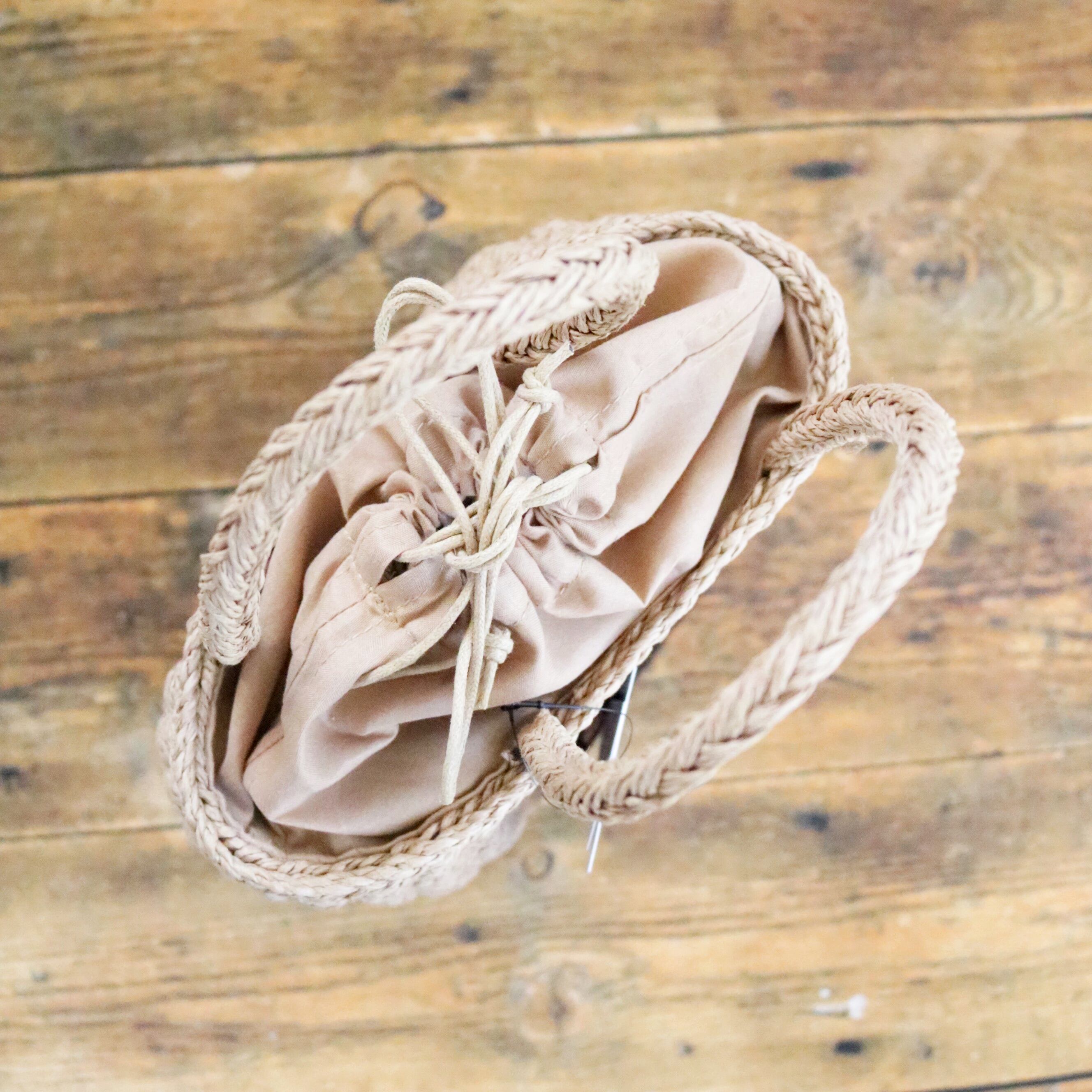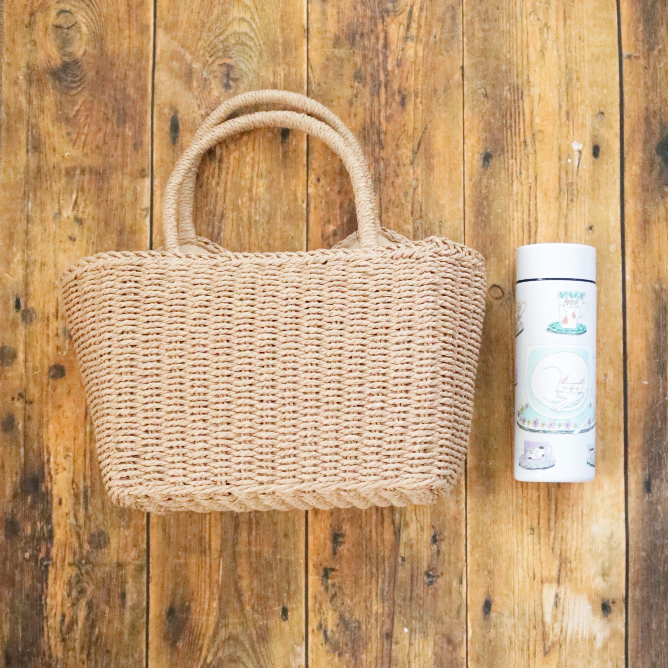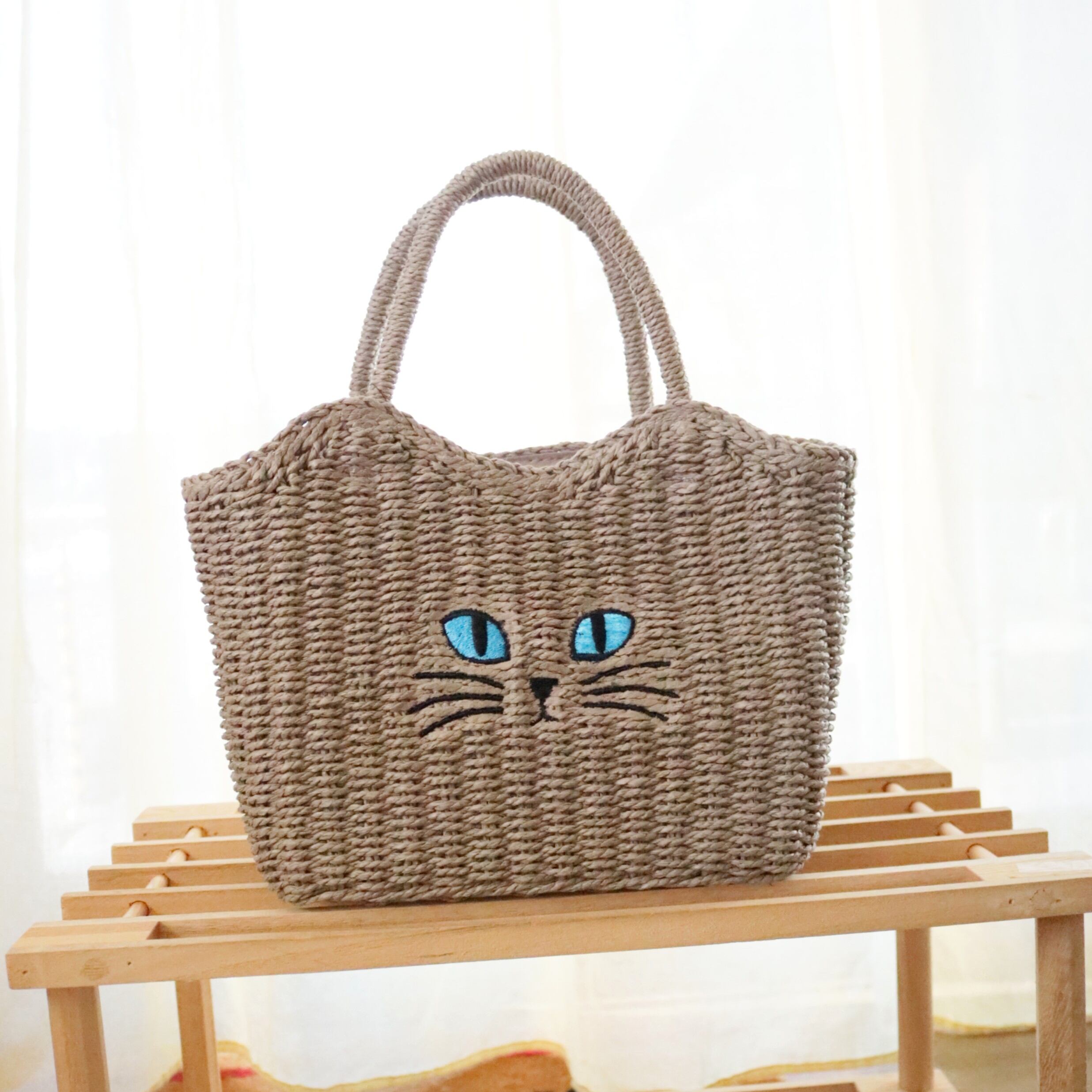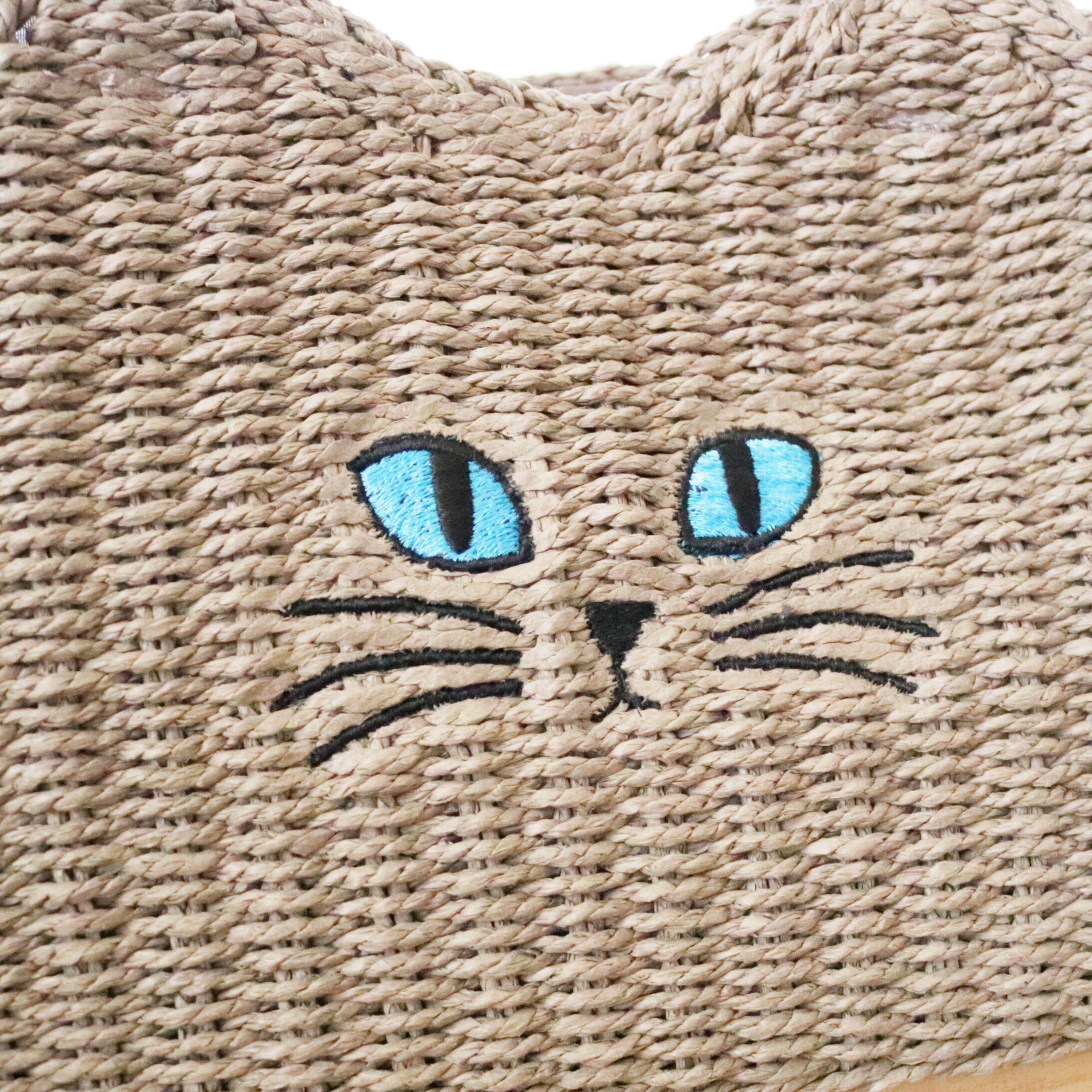 つぶらな瞳のネコがキュートな、かごバッグです。編み地が夏らしい軽やかな雰囲気を演出します。巾着タイプになっているので携帯や財布、水筒など、お出かけに必要なものがしっかりと収まります。