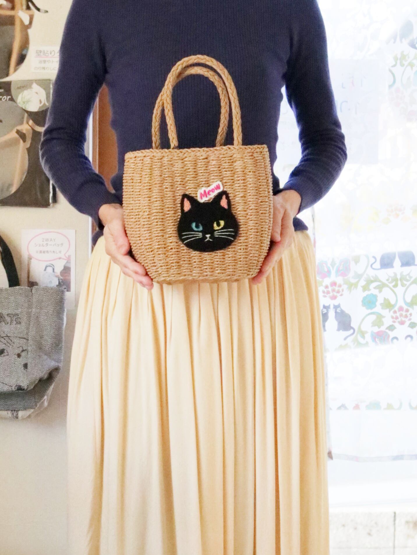 サガラ刺繍で表現された黒猫が、ふわふわとした立体感のある仕上がりに。ざっくりと編まれた雑材が軽やかな雰囲気を演出します。ミニ財布やスマートフォンなど、お出かけに必要なものがしっかりと収まります。普段使いはもちろん、ちょっとしたお出かけやリゾートスタイルにも合わせやすいです。
