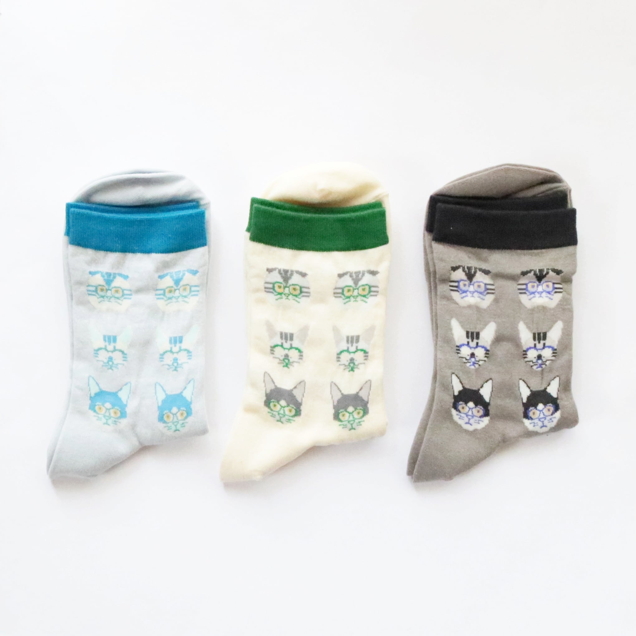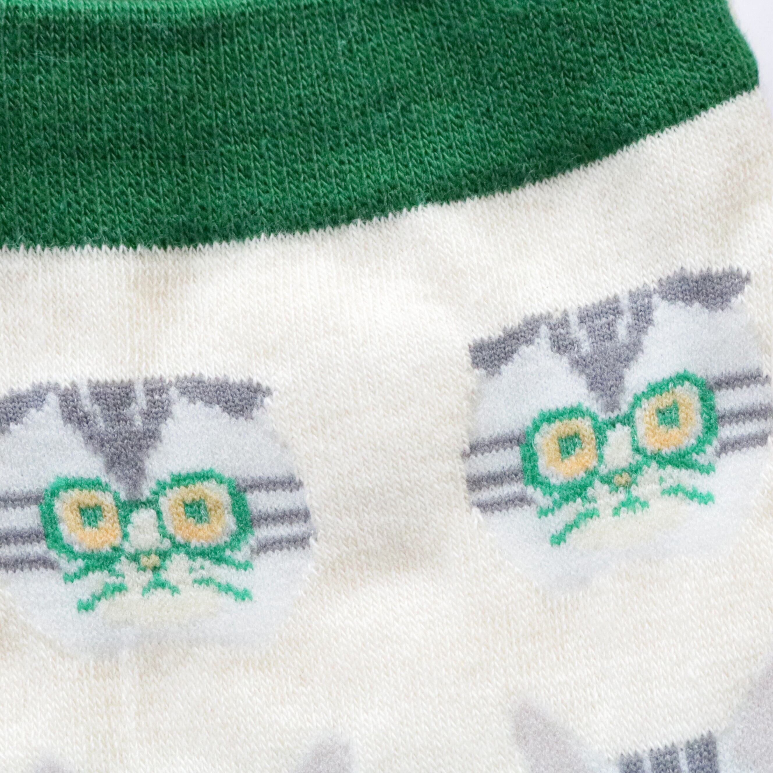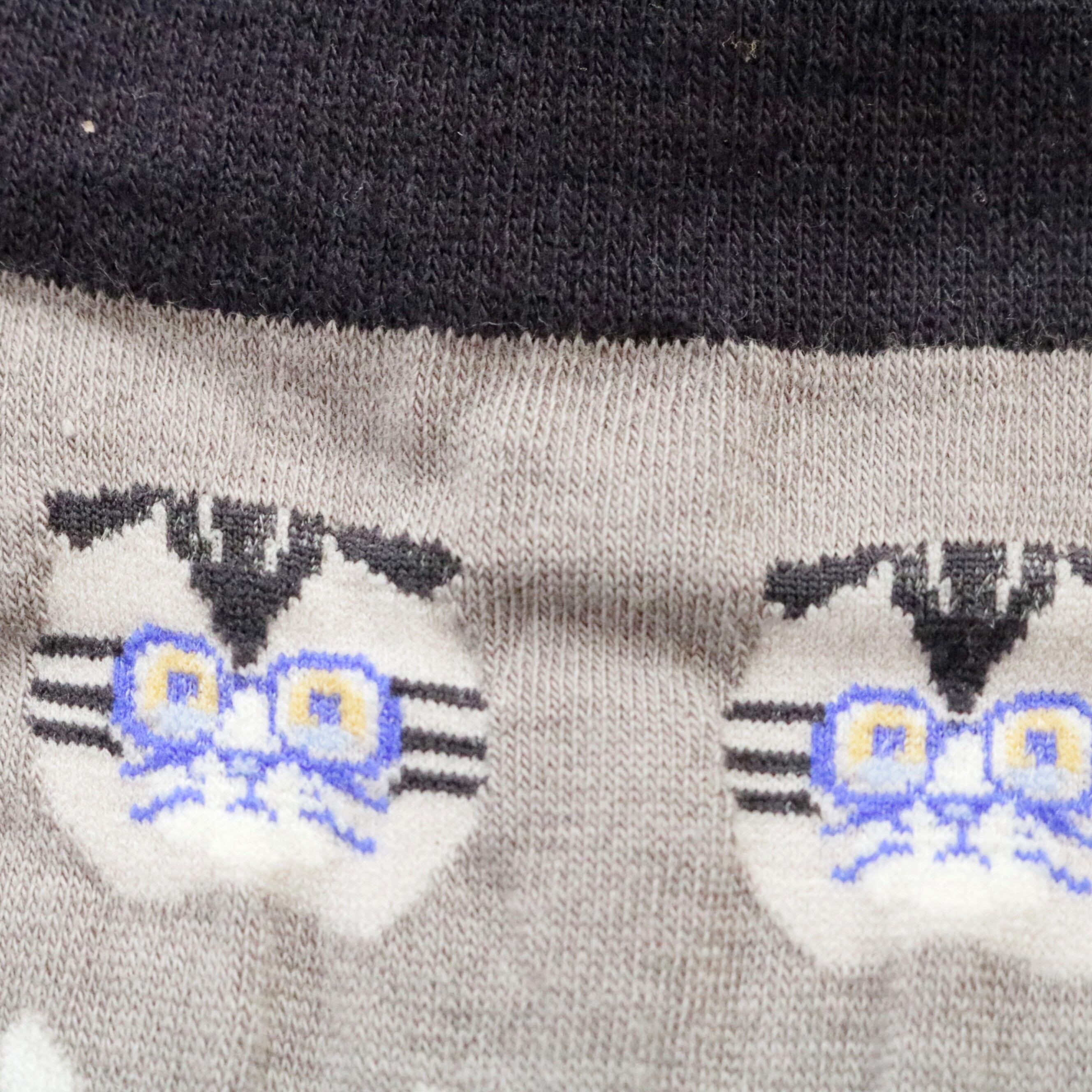 メガネの猫ちゃんがいっぱいのポップなデザイン。ライトグレー、グリーン、グレーの3色あります。
