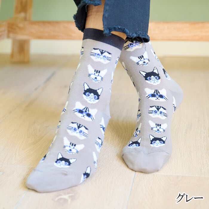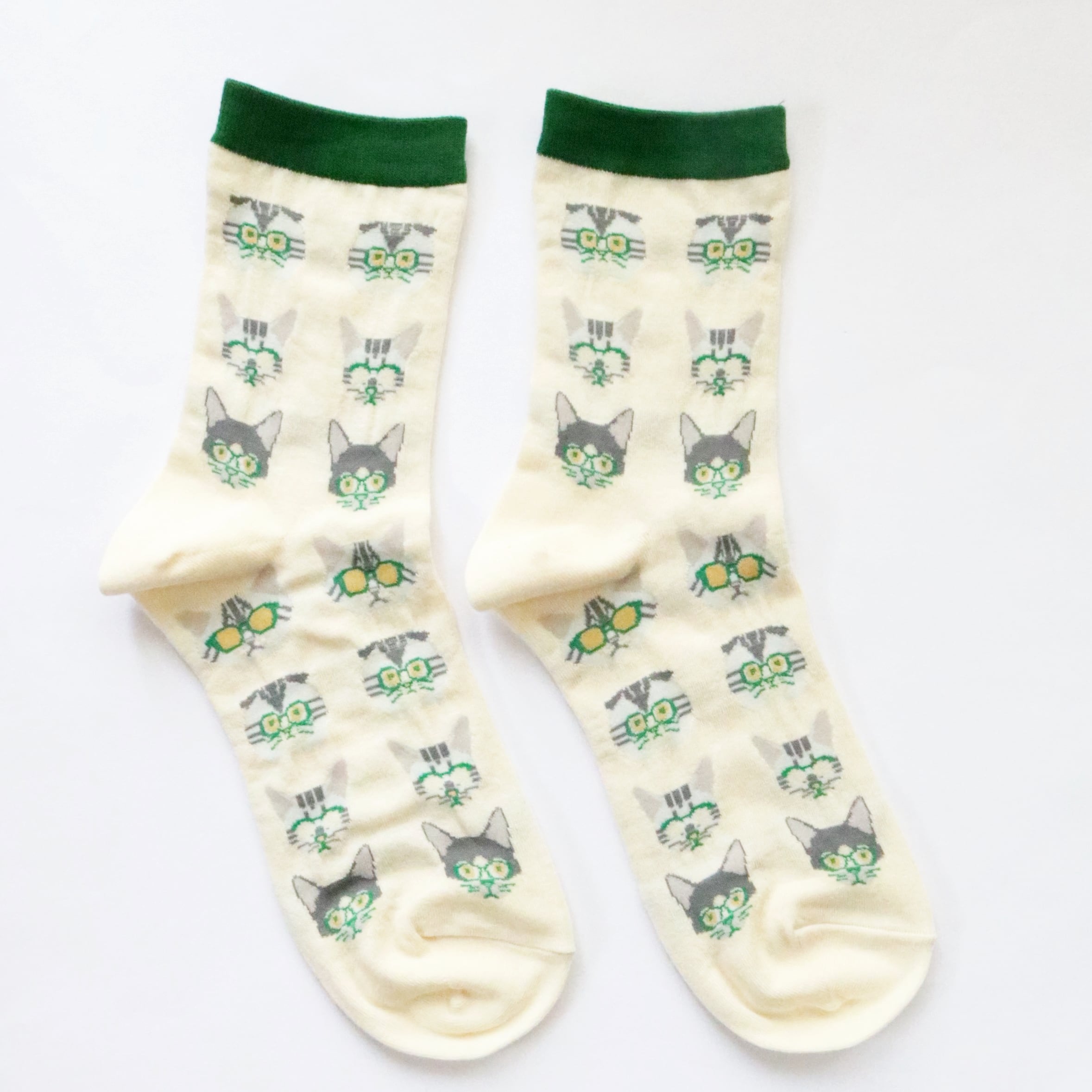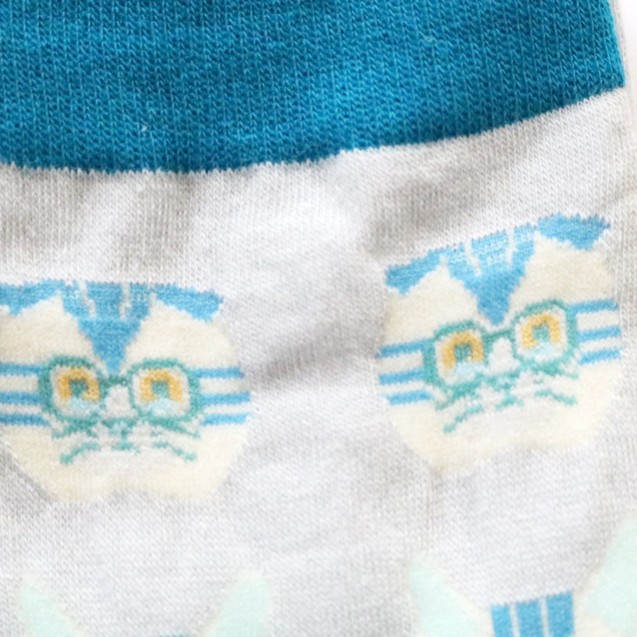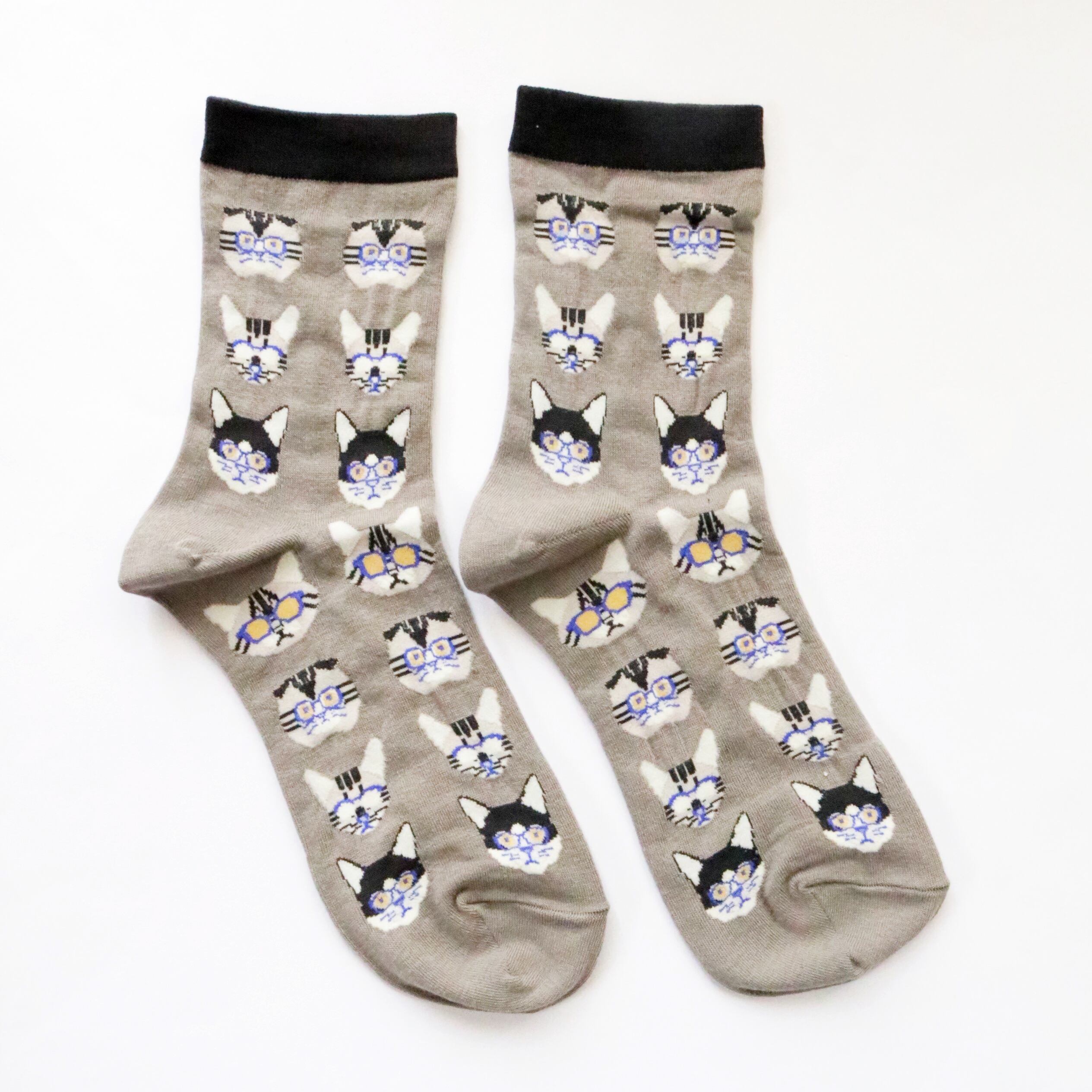 メガネの猫ちゃんがいっぱいのポップなデザイン。ライトグレー、グリーン、グレーの3色あります。
