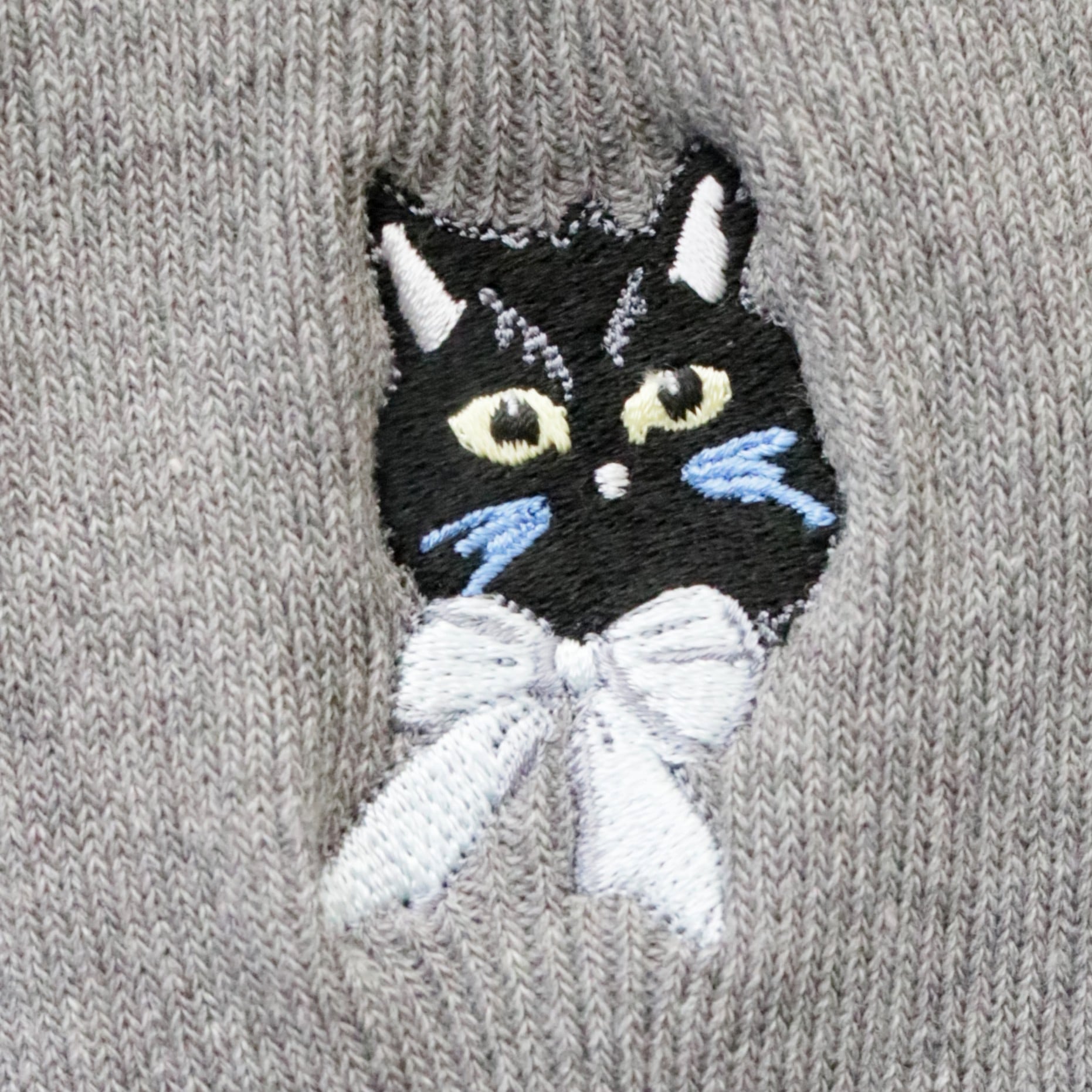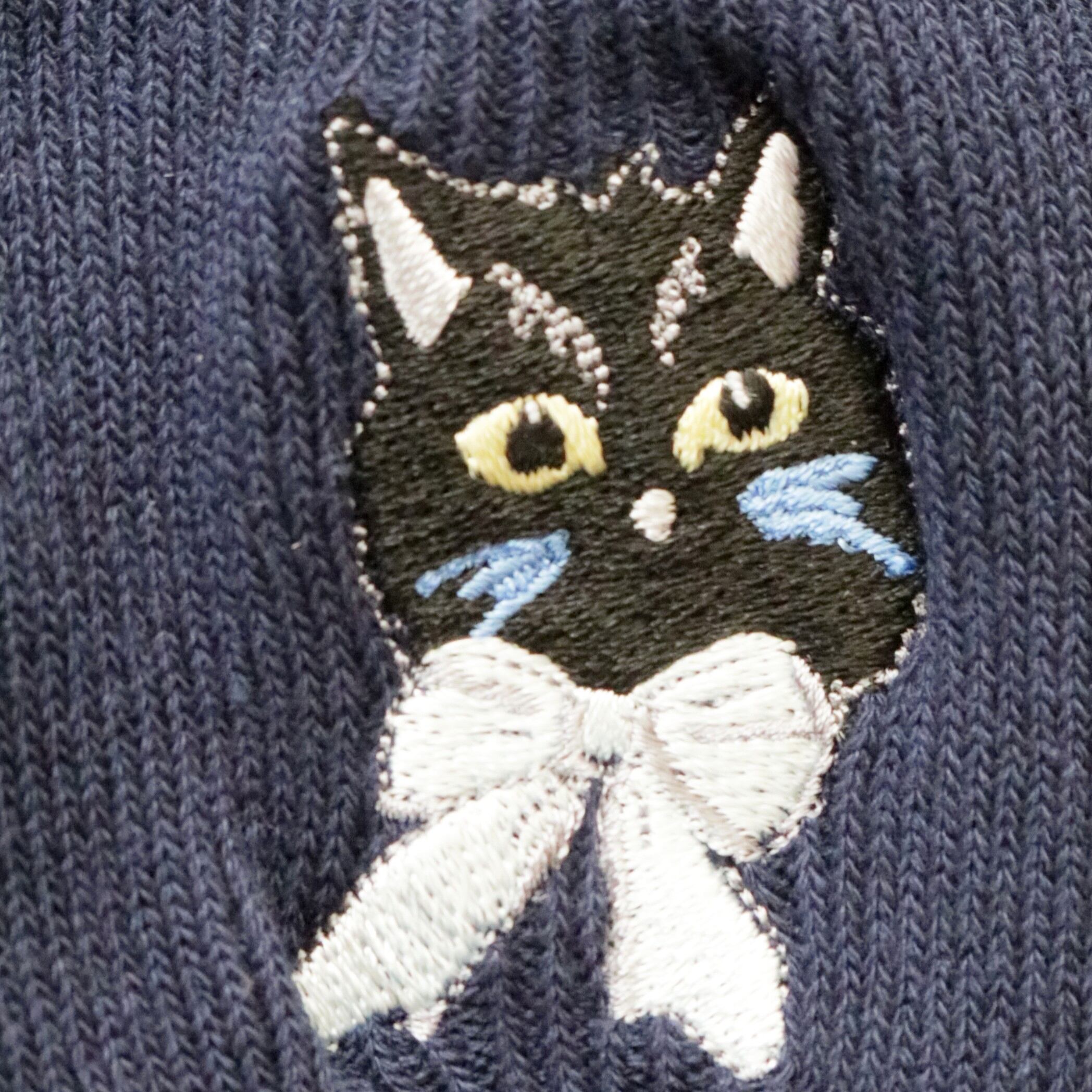 かわいい黒猫が片面(外側)に刺繍されています。