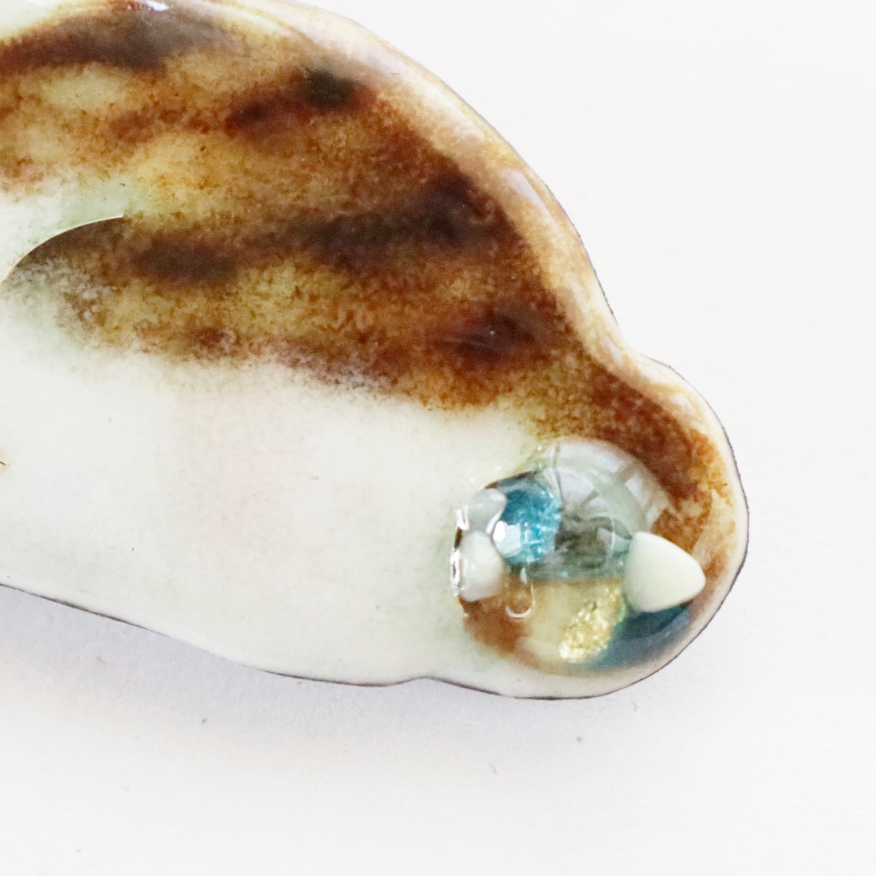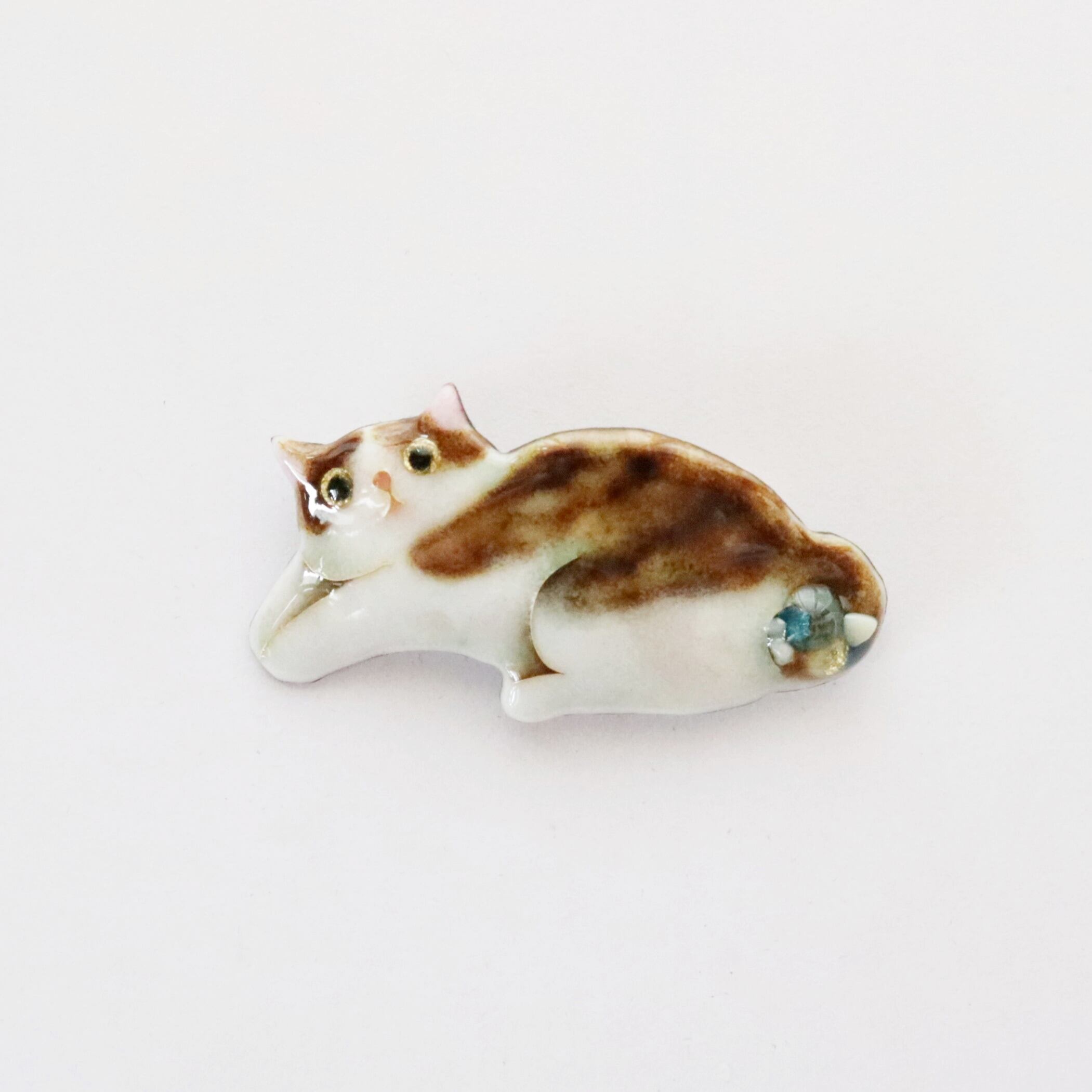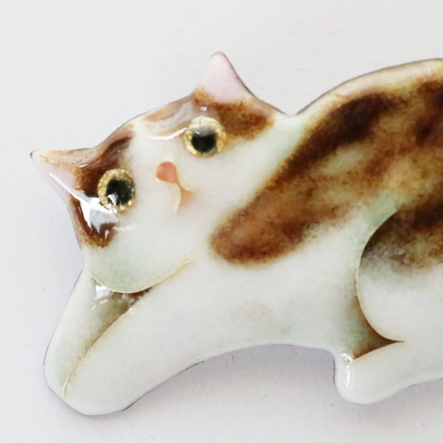 金、銀、真珠、翡翠、サンゴ、メノウ、琥珀の7種類の色が出せる七宝焼きで、猫の魅惑的な毛色を表現しています。