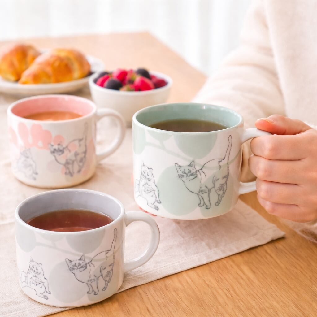 作家として活動している内村七生さんの美濃焼のカップ。猫と暮らす内村さんの視点で、猫好きにはたまらない可愛らしいしぐさと、草花をあしらった大人かわいいマグカップです。