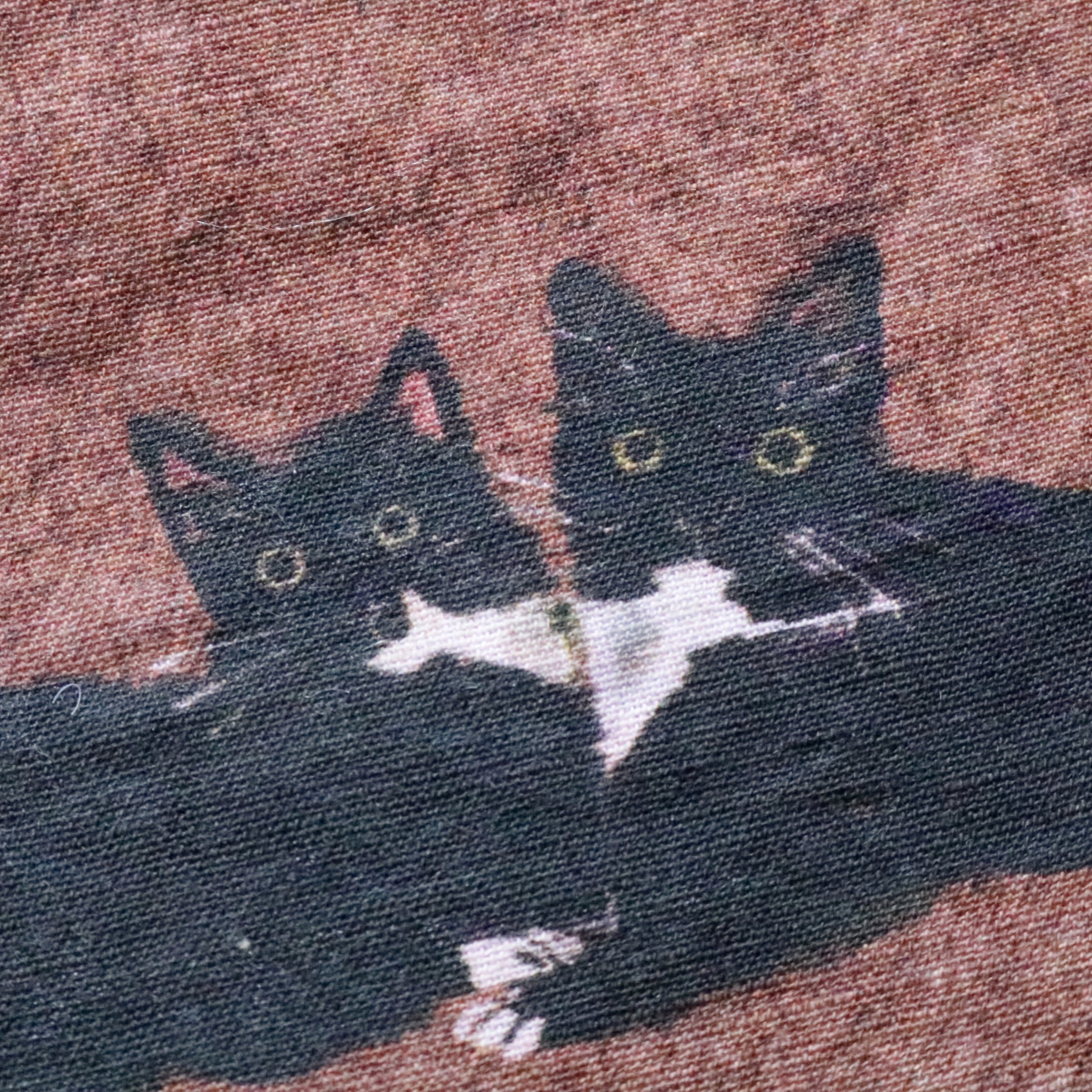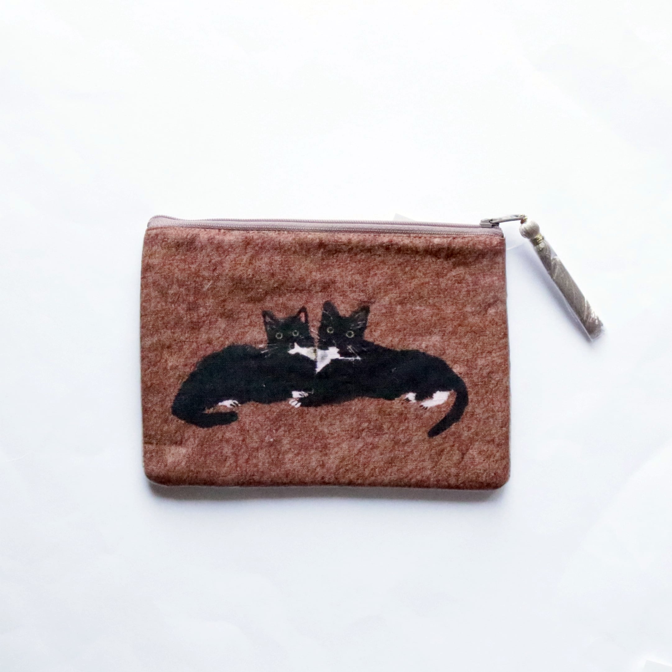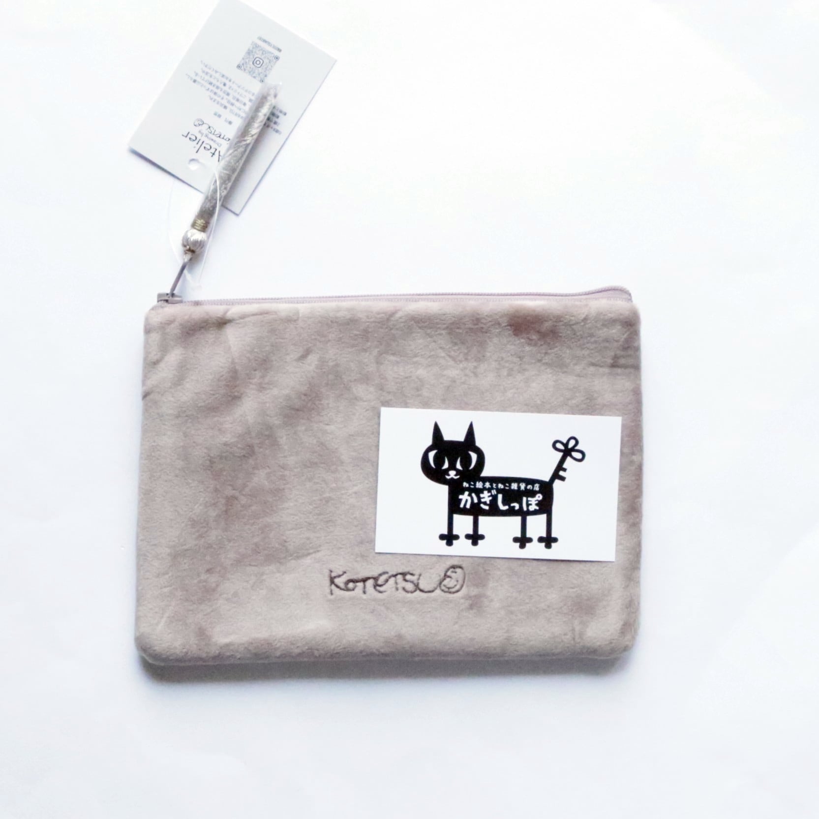表面には、アトリエKOTETSUさんが描く猫をデザイン。裏面には、なめらかな手触りが心地よいベロア生地に、KOTETSUさんのロゴが刺繍されています。ファスナー部分にはタッセルをあしらい、さりげないアクセントに。指先でつまみやすく開閉もスムーズ。