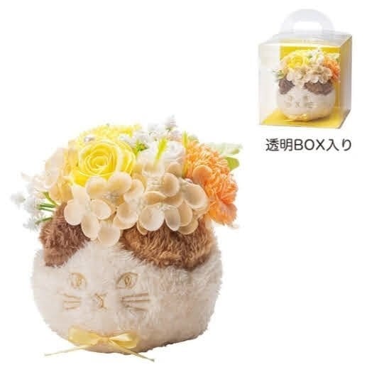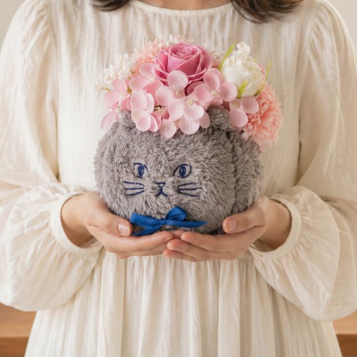 猫のふわふわポットソープフラワー。お顔はツンと大人っぽいタイプで、甘すぎない可愛らしさが魅力。「ソープフラワー」は⽯鹸でできたお花で何の⼿⼊れもいらず枯れることがありません。ふんわりとしたやさしい石けんの香りと鮮やかな色合いが一日を明るくしてくれる、お手入れ不要のお花です。