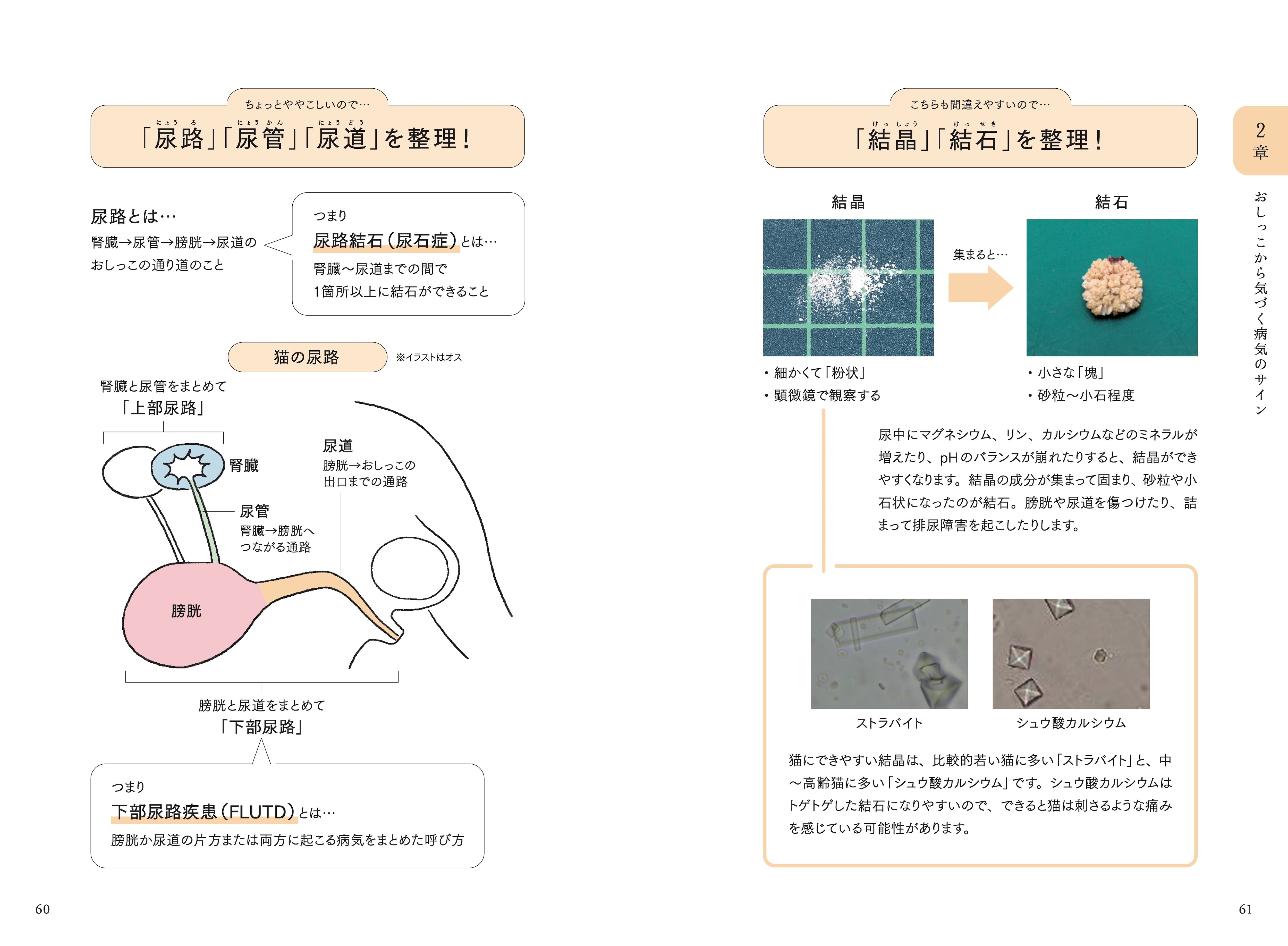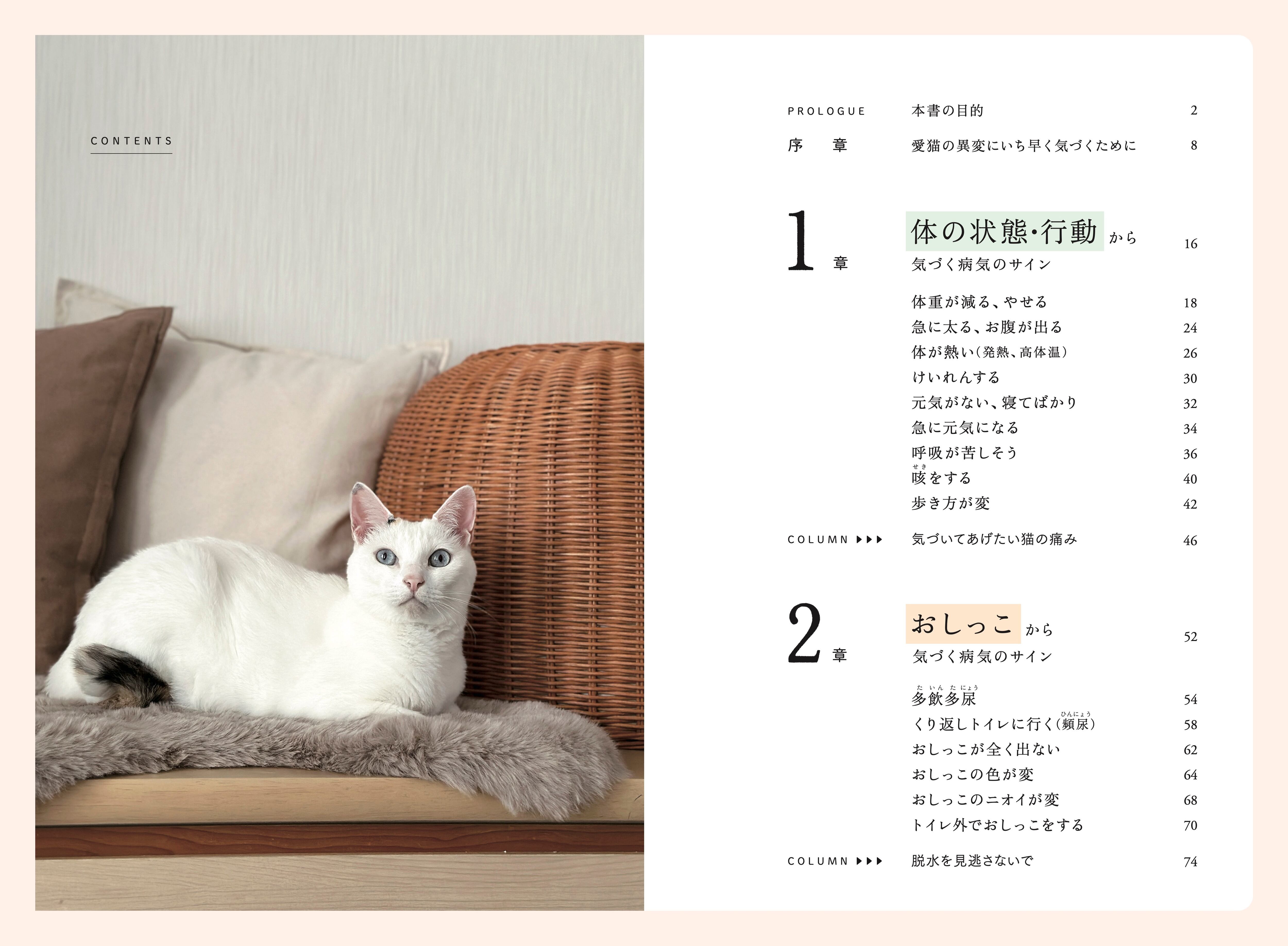 ということが多々あります。そこで本書では、猫の見た目や行動から発せられるSOSのサイン(症状)とそのサインから考えられる原因を全ページカラーで読みやすくまとめました。